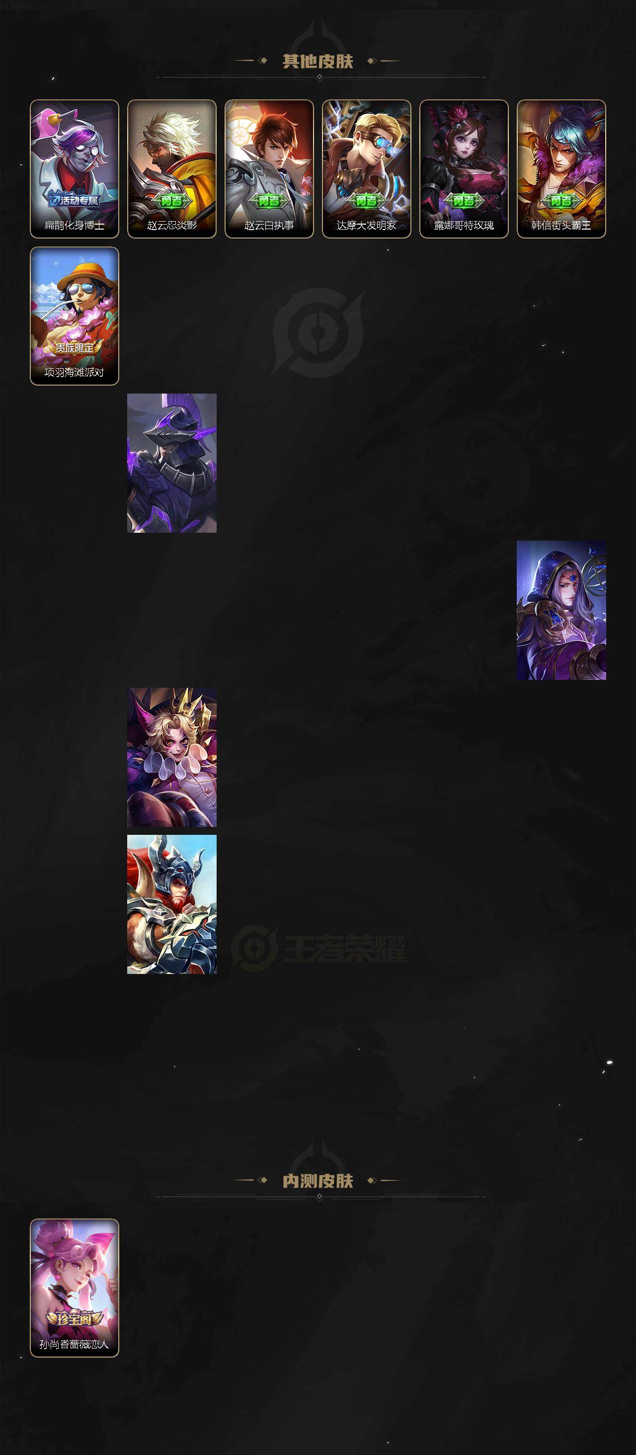 【传说皮肤】:云缨神骥越千峰,司空震愿照山河定,澜愿照九州拓,虞姬愿照岁时盈,云缨幻光神枪,嬴政玄雷天君,桑启鸣野蒿,典韦战鼓燎原,马可波罗妄想实况,虞姬启明