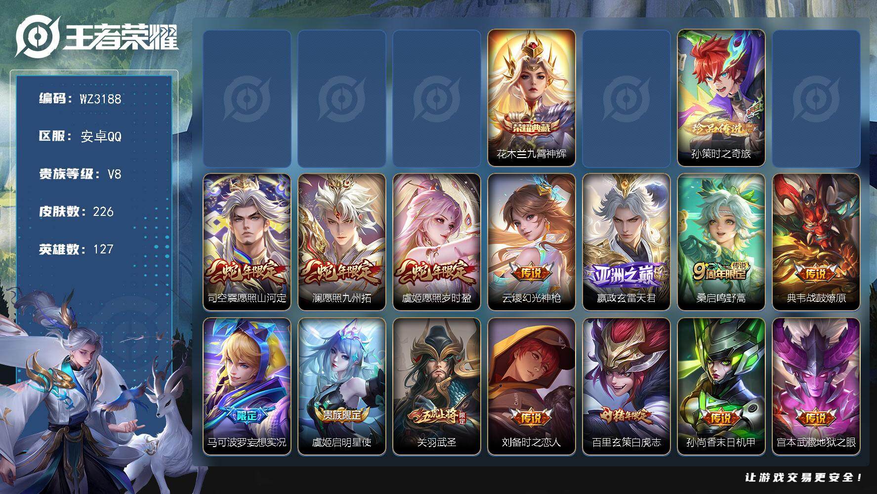 【秒换绑】安卓Q-V8-最强王者段位-127英雄-226皮肤-1典藏皮肤-1珍品传说-16传说-71史诗