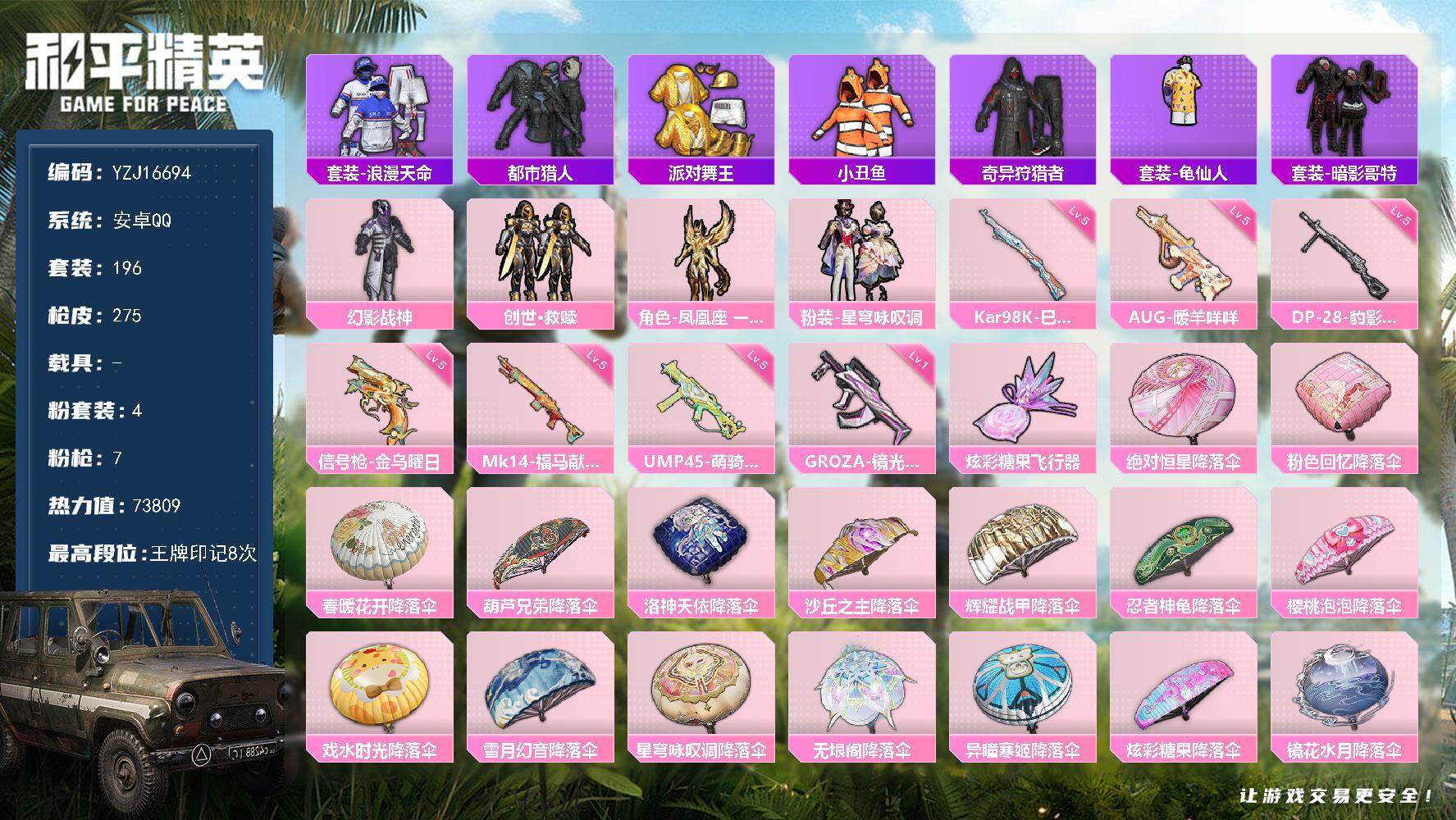 2582395_实名可改安卓Q都市金鞋红眼罩小丑鱼-7稀有4粉装7特效枪15热门196套装275枪皮73674热力值8印记历史卓越王牌13星【7稀有】奇异狩猎者AWM-黄金龙骨AKM-百万伏特都市猎人浪漫天命派对舞王派对舞王(金靴子)【4粉装】凤凰座一辉星穹咏叹调创世救赎幻影战神【7特效枪】Kar98K-巳巳如意(5级)DP-28-豹影疾电(5级)AUG-暖羊咩咩(5级)GROZA-镜光银凌(5级