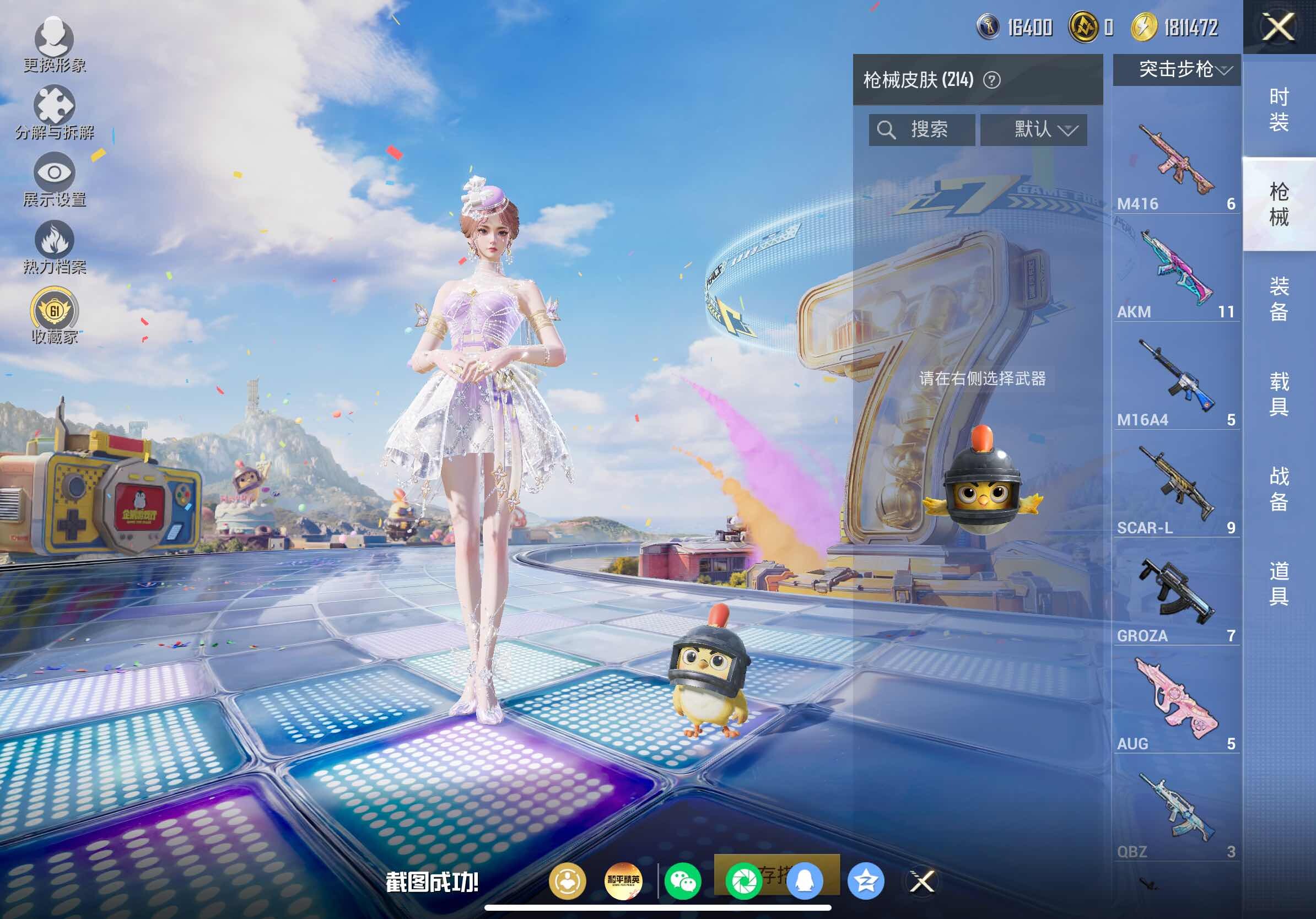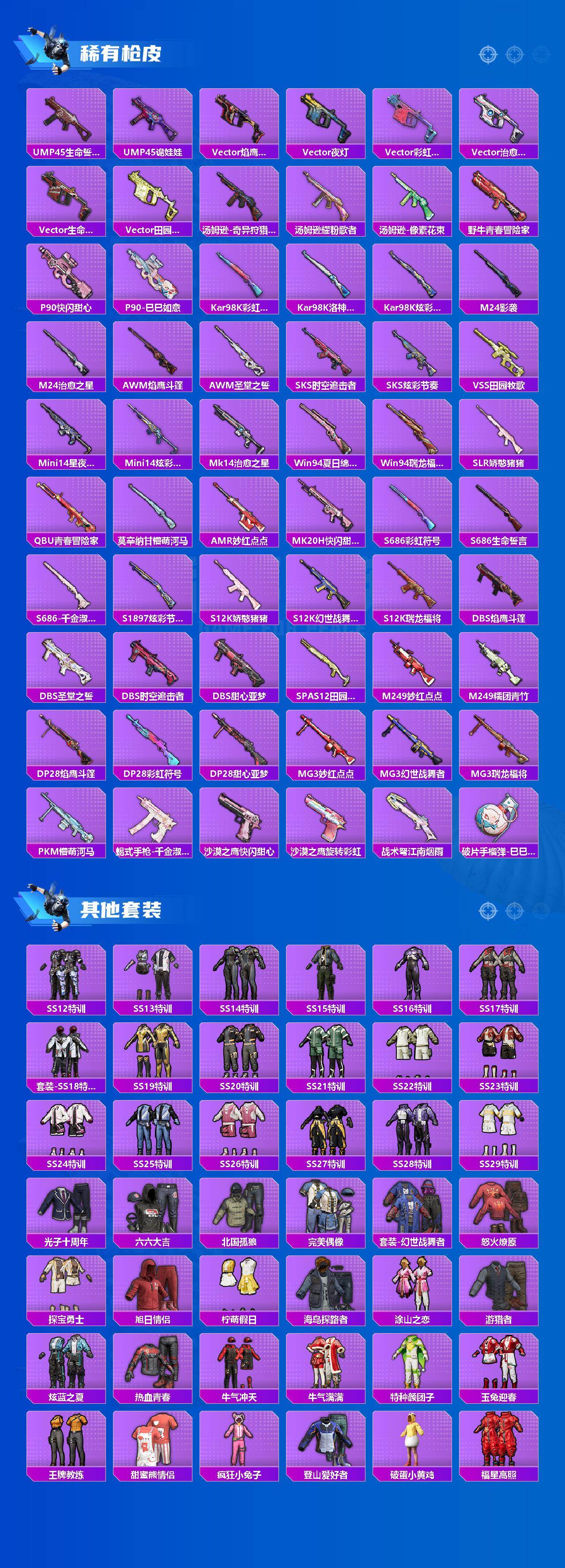 【粉色枪皮等级】:AKM-梦之光华(七级),M416-心之恋语(七级),蜜獾-荧海星豚(七级),Kar98K-巳巳如意(五级),DP-28-豹影疾电(五级),MG3-洛神天依(七级)