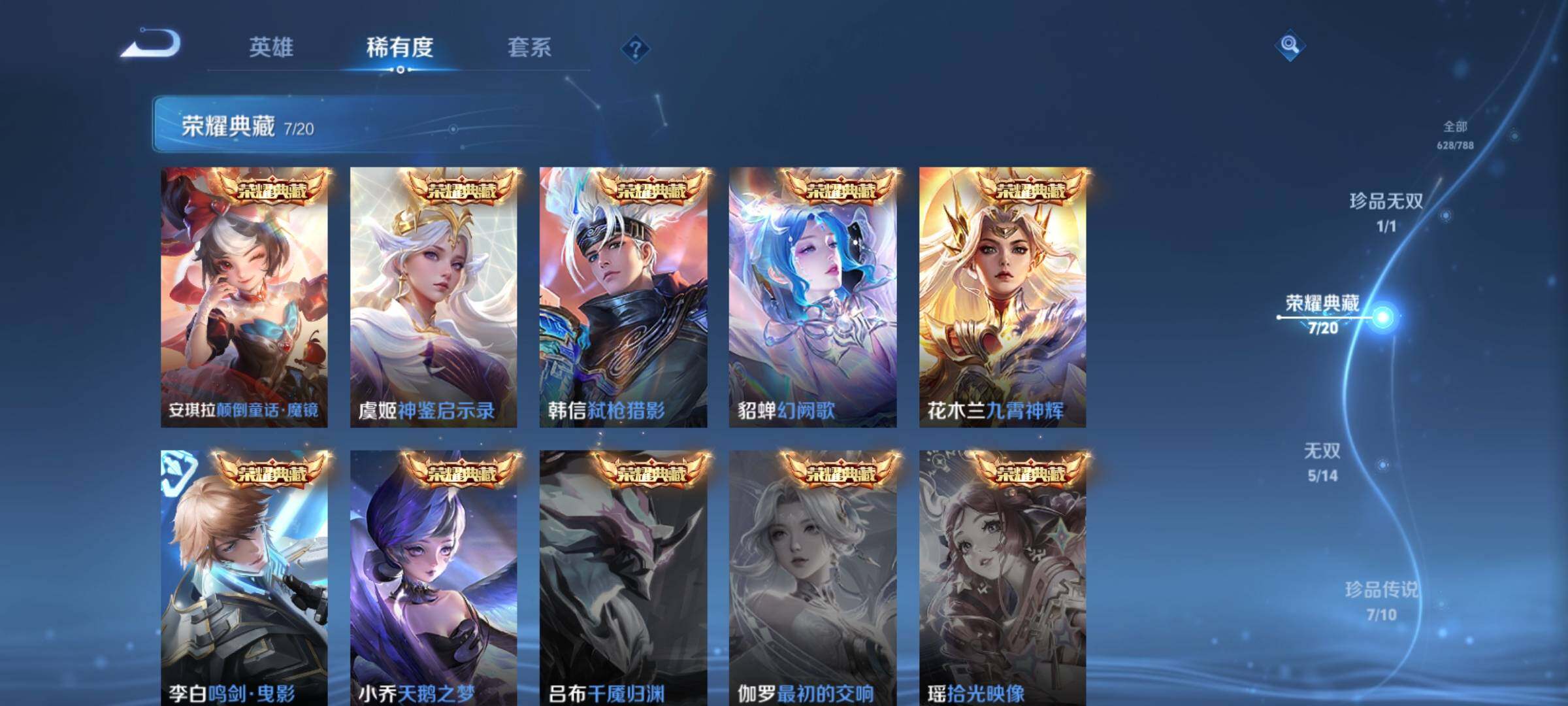 可换绑【精品无双v10号推荐·流光积分7w·有传承位·安琪拉大乔西施全皮··珍品无双貂蝉·多典藏珍品皮·多生肖全套·多限定皮·星穹之声·多天幕星传说·贵族积分44w】 29按键,8星传说,9天幕,1小兵,221戳戳,25王者印记,满级铭文,可二次,安卓Q-V11-628皮肤-7典藏皮肤-1典藏英雄-1珍品无双-5无双-7珍品传说-104传说-202史诗【英雄全皮】: