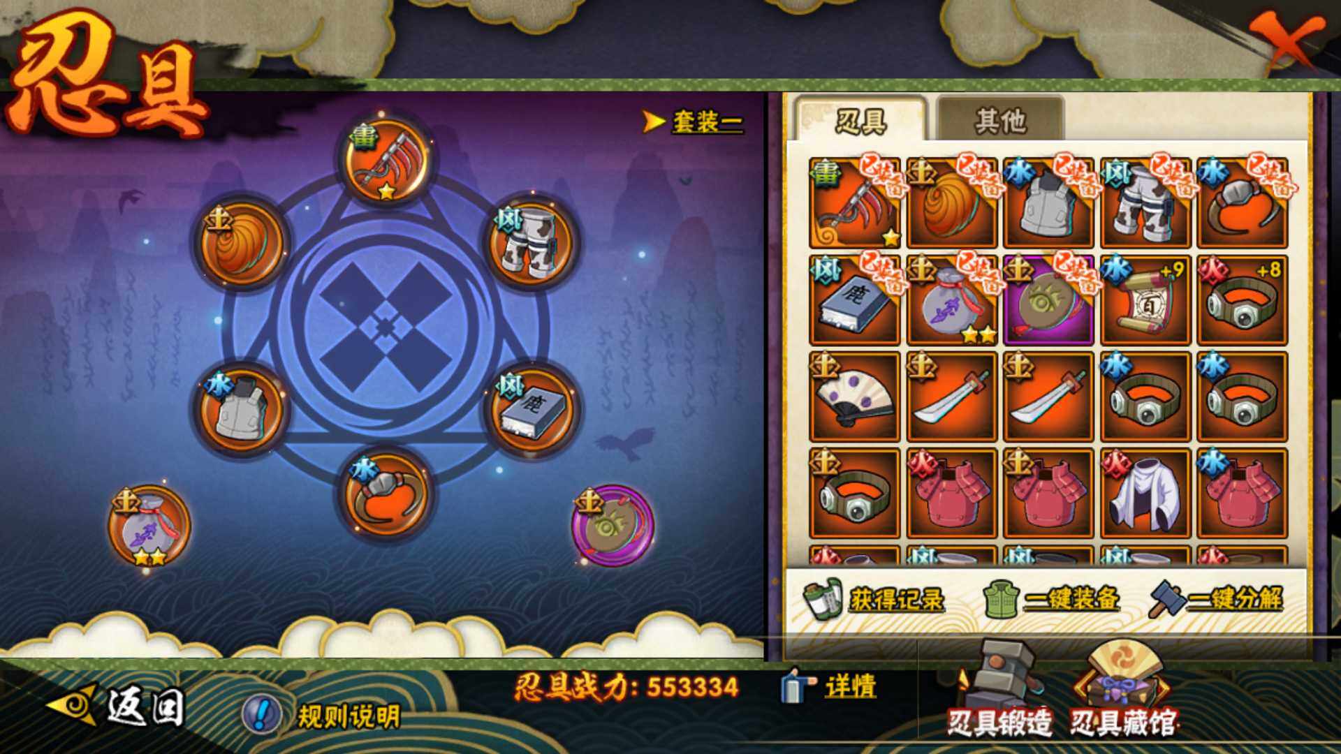 【S级忍者】:宇智波带土「忍界大战」(3星),宇智波鼬「须佐能乎」(3星),自来也「舞之豪杰」(3星),大蛇丸(3星),波风水门(3星),神秘面具男「红夜之刃」(3星),佩恩「天道」(3星),宇智波佐助「永恒万花筒」(3星),大筒木舍人「最终章」(3星),漩涡鸣人·宇智波佐助(3星)
