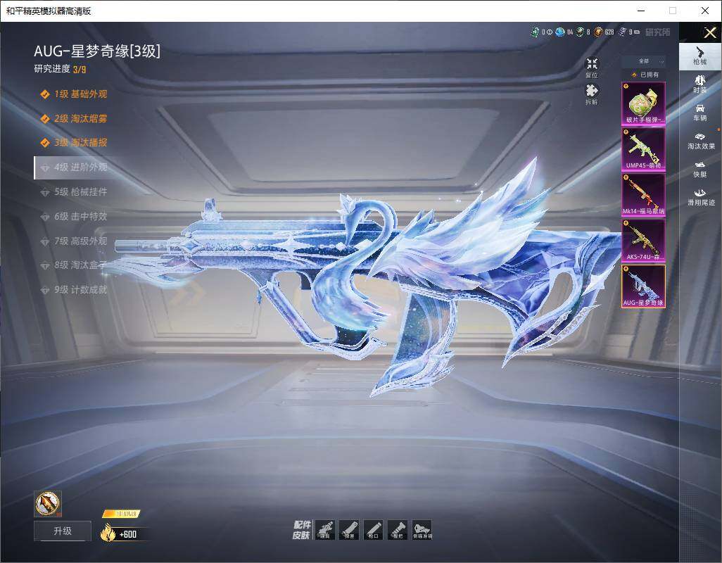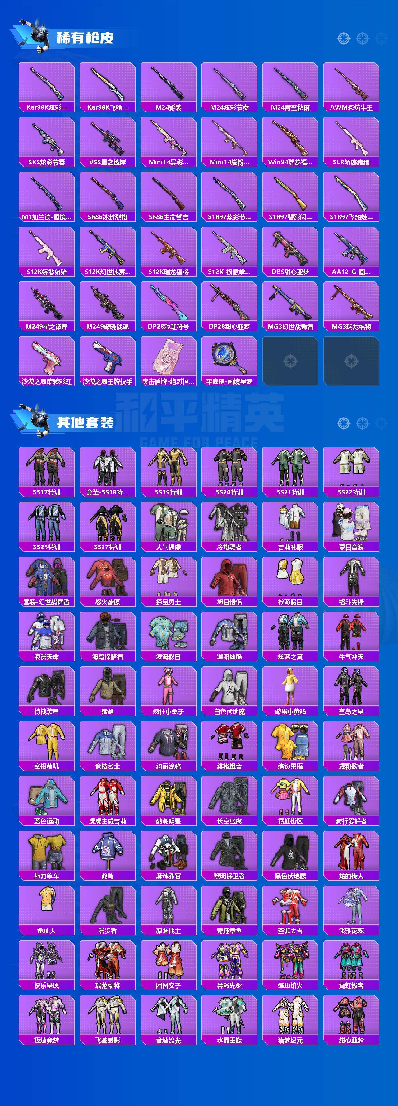【粉色枪皮等级】:AUG-星梦奇缘(三级),UMP45-萌骑冒险(四级),AKS-74U-森灵之息(五级),Mk14-福马献瑞(五级),破片手榴弹-贪吃小熊
