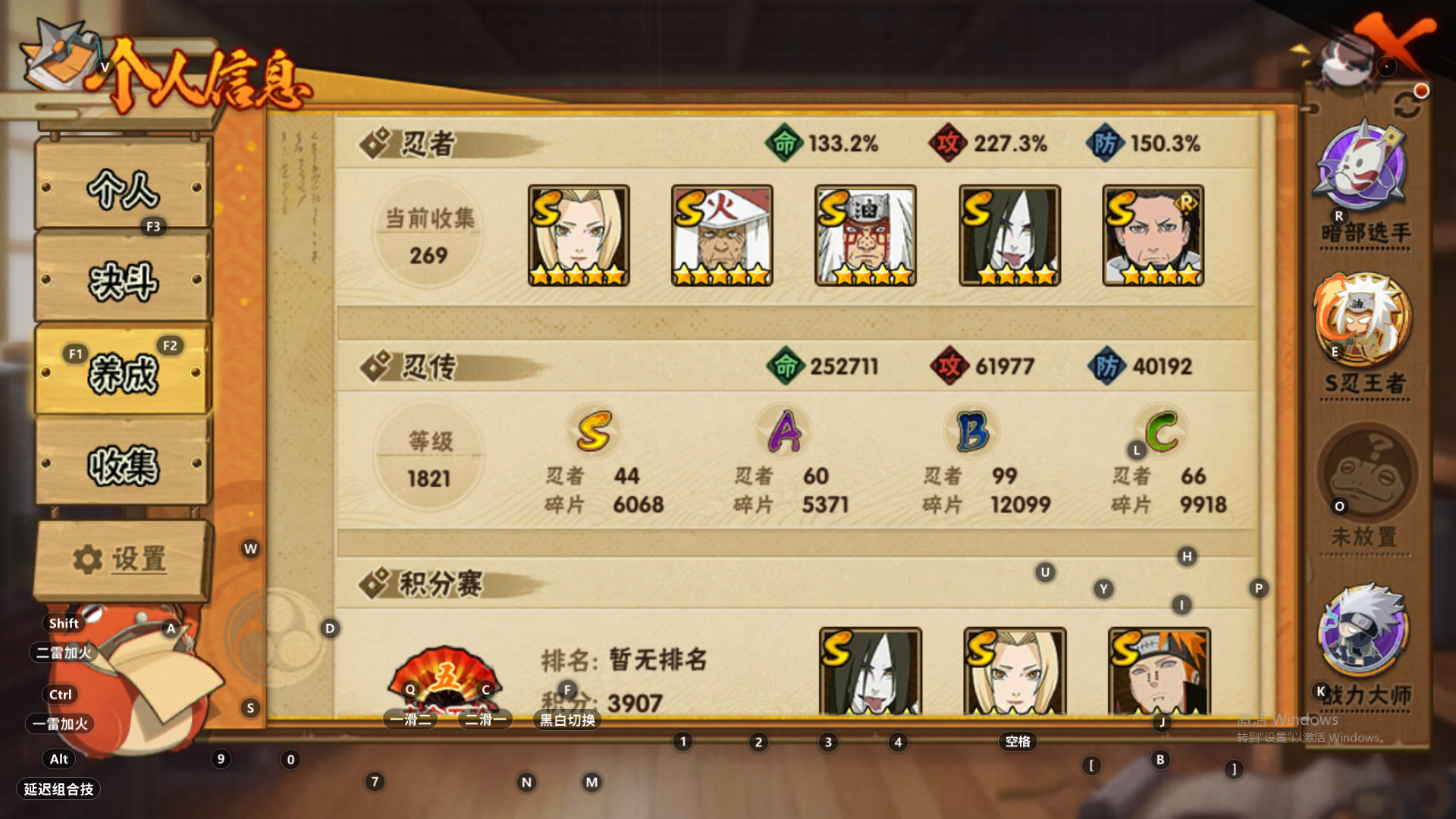 2178W战力超哥三风创斑44S+黑绝盾狗9个198直购A60A+舍人碎片80小胡子碎片60碎片忍战土豆64碎片+国宝