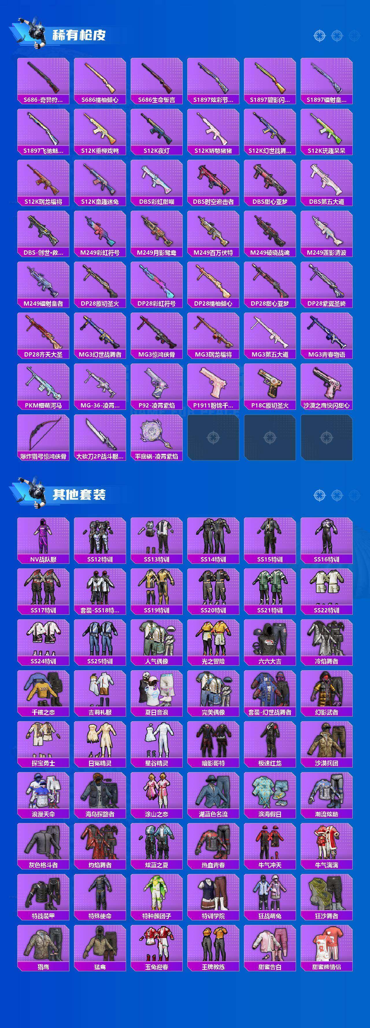 公主号-梦幻火箭/缤纷油彩/浪漫天命/都市/深海小丑鱼/奇异狩猎者/暗影哥特/软软马卡龙/天使彩虹糖/梦幻火箭/缤纷油彩/馨动时刻/碧影闪光/岚岚物语/海盐物语/恐龙拽拽/闪耀律动/橘柚倾心/第五大道/角色霁蓝缠春/SCARL梦幻火箭(七级)/AWM橘柚倾心(六级)/VSS烈焰拳霸(五级)/M417第五大道(七级)/宝马M4(圣保罗黄)/焰龙咆哮 没战神框(12粉装9特效枪2载具)HP7960-
