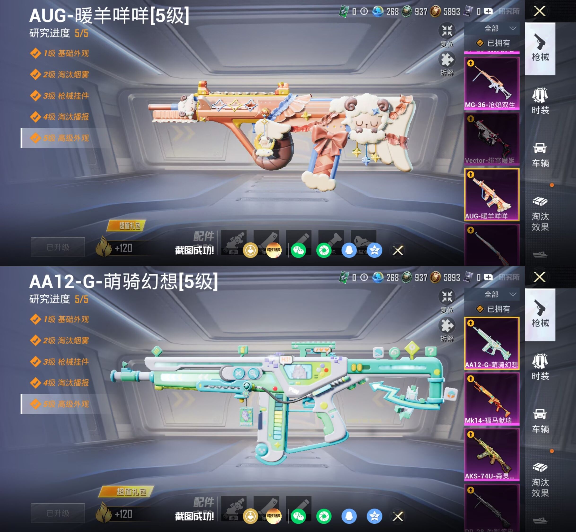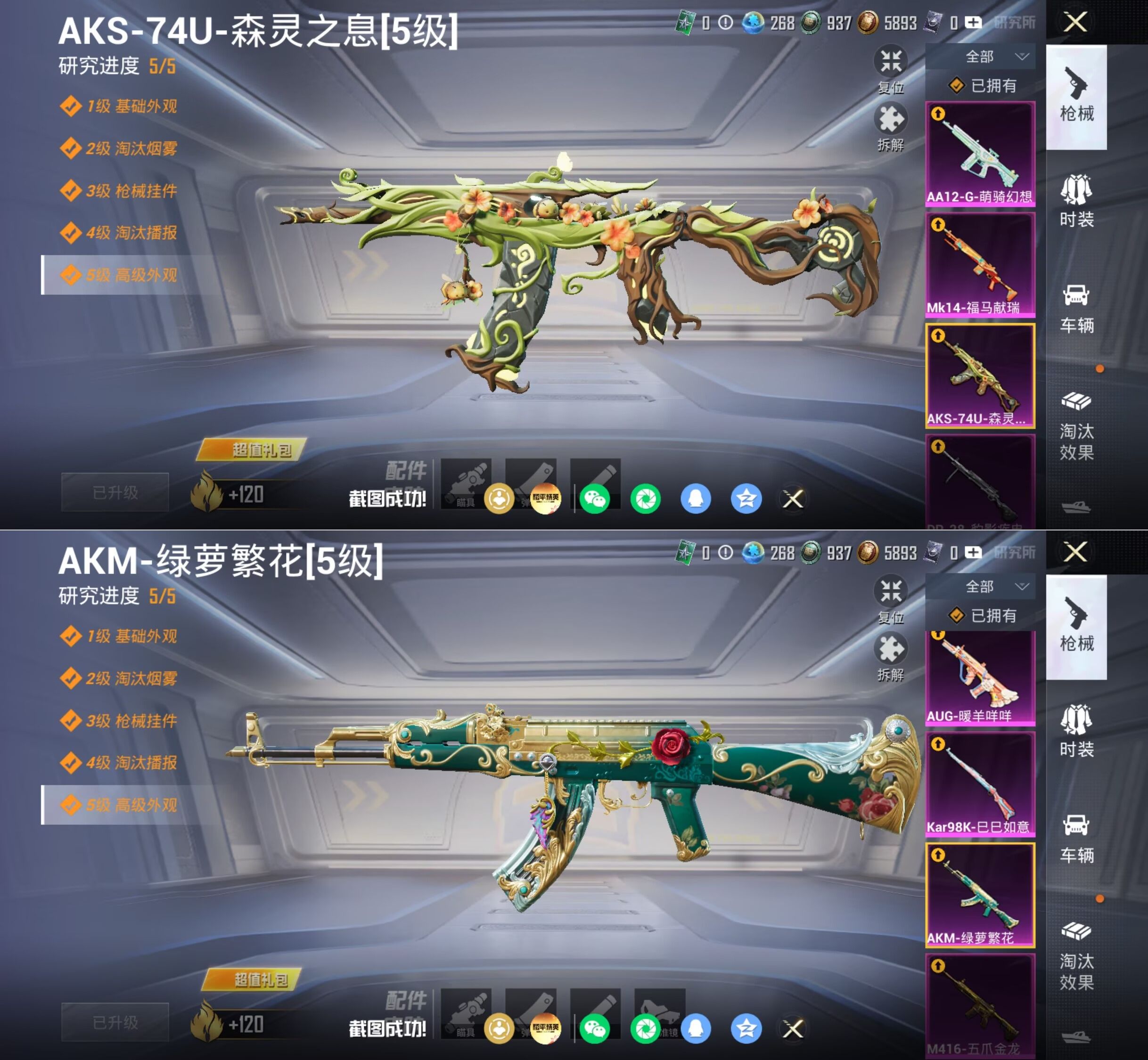 【10特效枪】M416-五爪金龙[7级],Mk14-福马献瑞[5级],AKM-绿萝繁花[5级],DP-28-豹影疾电[5级],Kar98K-巳巳如意[5级],AA12-G-萌骑幻想[5级],AKS-74U-森灵之息[5级],Vector-绯穹魔姬[7级