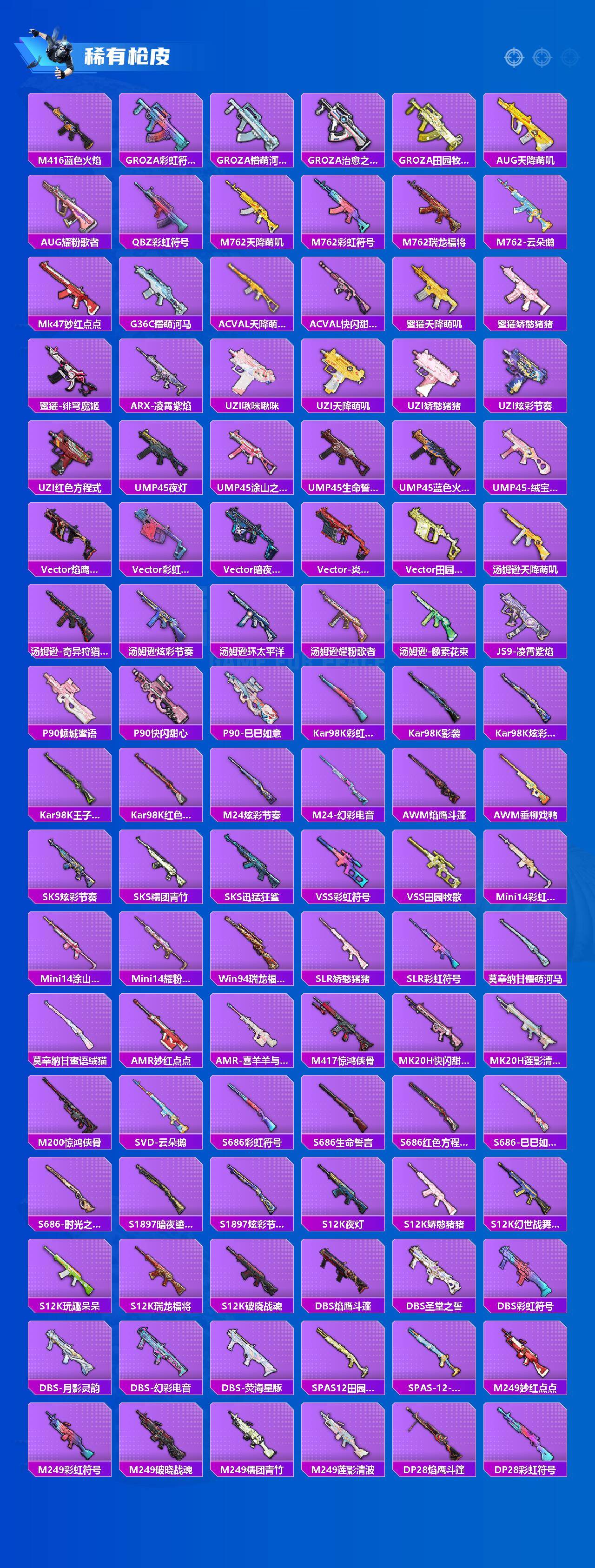【粉色枪皮等级】:AKM-绿萝繁花(五级),SCAR-L-锦绣绵绵(五级),M416-风花雪月(七级),M416-电玩时刻(五级),GROZA-镜光银凌(五级),