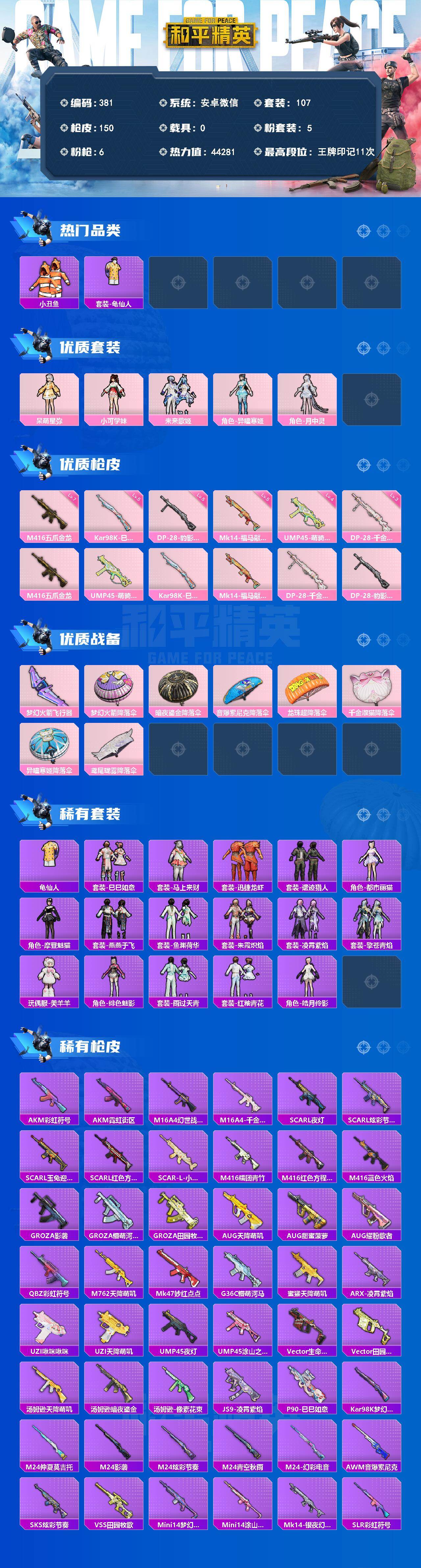 HJ6802 可二 61级 5粉装6特效枪107套装150枪皮 11印记 【5粉装】 月中灵 异瞳寒姬 未来歌姬 呆萌星弥 小可学妹 【6特效枪】 M416-五爪金龙 (7级) Kar98K-巳巳如意 (5级) DP-28-千金淑猫 (3级) DP-28-豹影疾电 (5级) Mk14-福马献瑞 (5级) UMP45-萌骑冒险 (4级) 【5热门】 小丑鱼 龟仙人 呆萌铁蟹 迅捷狂鲨 破蛋小黄鸡 【1飞行器】 梦幻火箭飞行器 【1头盔】 梦幻火箭头盔 【2背包】 梦幻火箭背包 深海小丑鱼背包