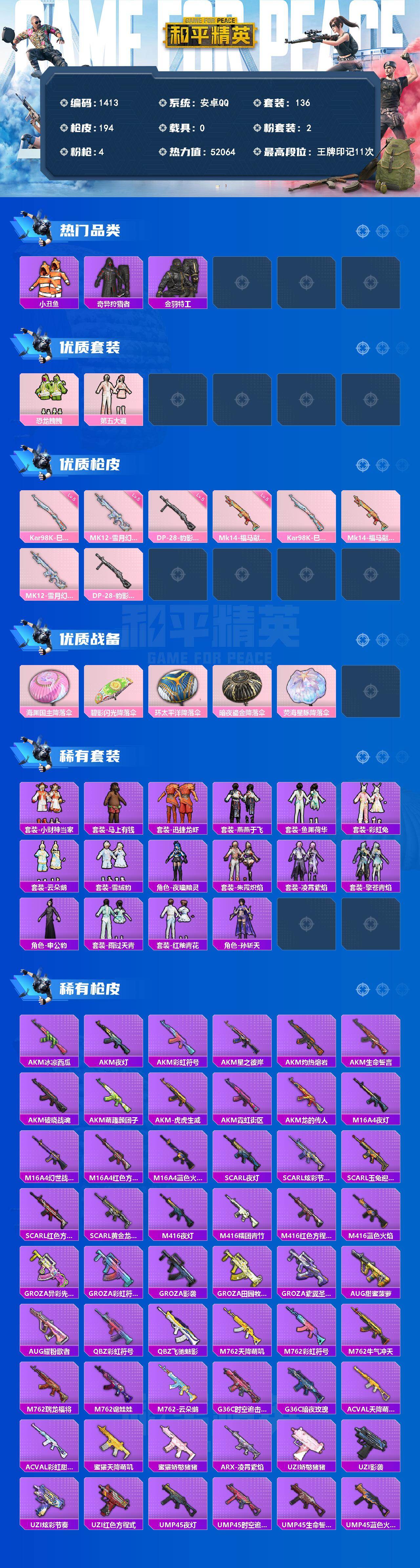【4粉枪2粉枪 小丑鱼 奇异狩猎者】安卓 手Q-2粉装-4特效枪-0载具-0粉色飞行器-52064热力值-11王牌印记-136套装-194枪皮
