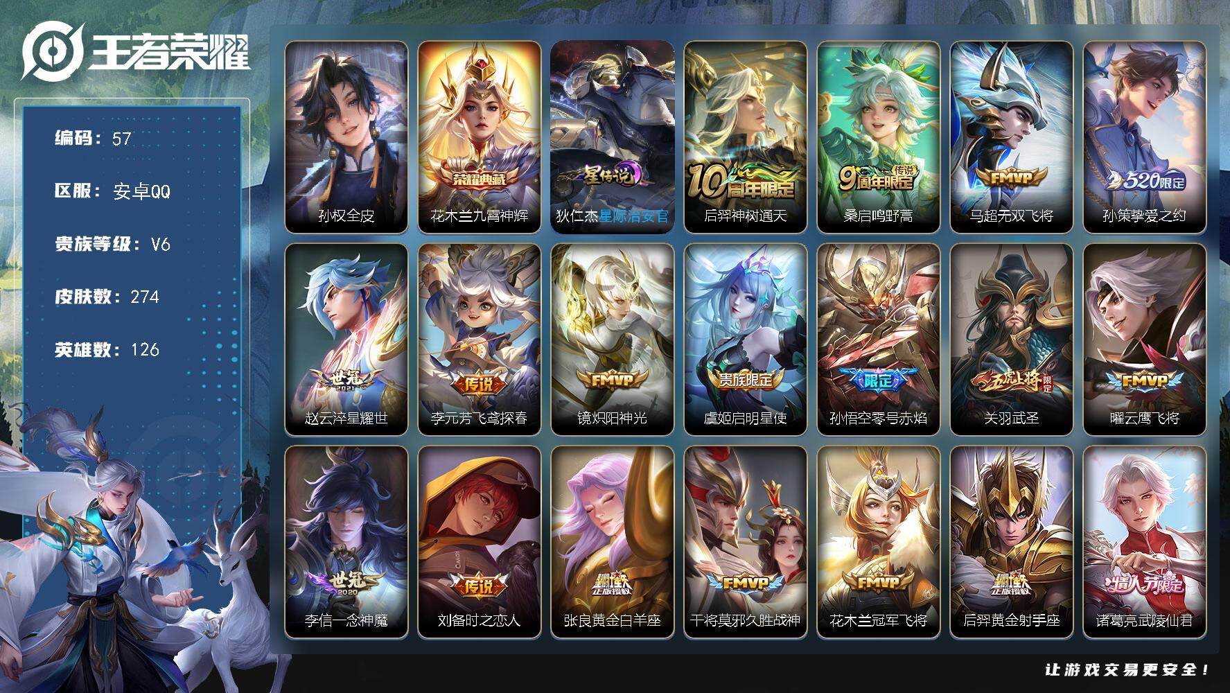 【编号77969,可秒换绑】【皮肤质量扎实。该有的都有,适合回坑玩家!】星际治安官,安卓Q-V6-最强王者段位-126英雄-274皮肤-1典藏皮肤-20传说-71史诗【英雄全皮】:孙权全皮【荣耀典藏】:花木兰九霄神辉【传说皮肤】:后羿神树通天,桑启鸣野蒿,马超无双飞将,孙策挚爱之约,赵云淬星耀世,李元芳飞鸢探春,镜炽阳神光,虞姬启明星使,孙悟空零号赤焰,关羽武圣,曜云鹰飞将,李信一念神魔,刘备时之恋人,张良黄金白羊座,干将莫邪久胜战神,花木兰冠军飞将,后羿黄金射手座,诸葛亮武陵仙君,宫本武藏地狱