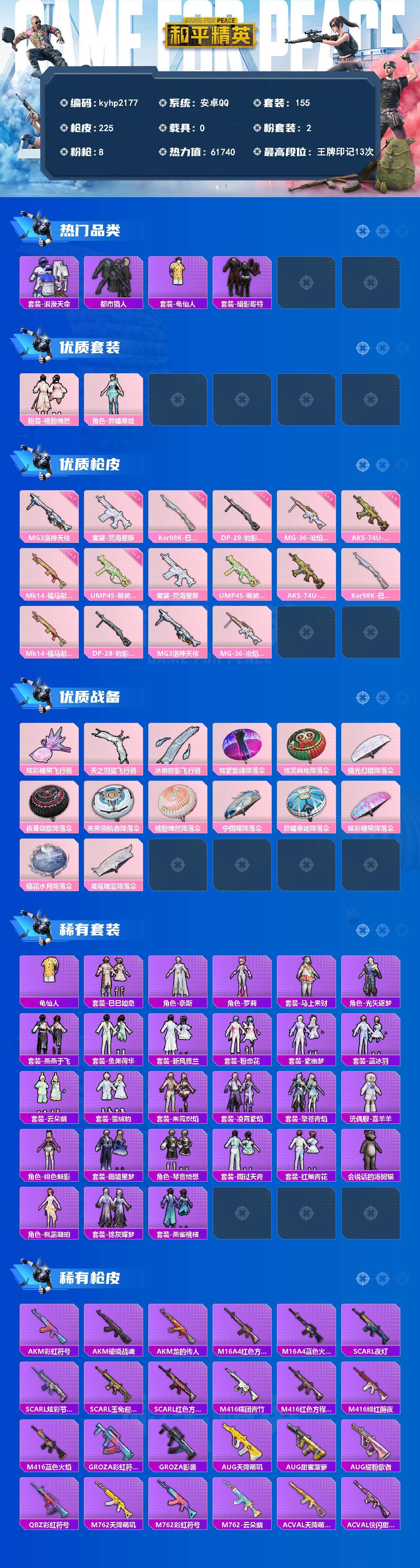 安卓 手Q-2粉装-8特效枪-0载具-3粉色飞行器-61740热力值-13王牌印记-155套装-225枪皮