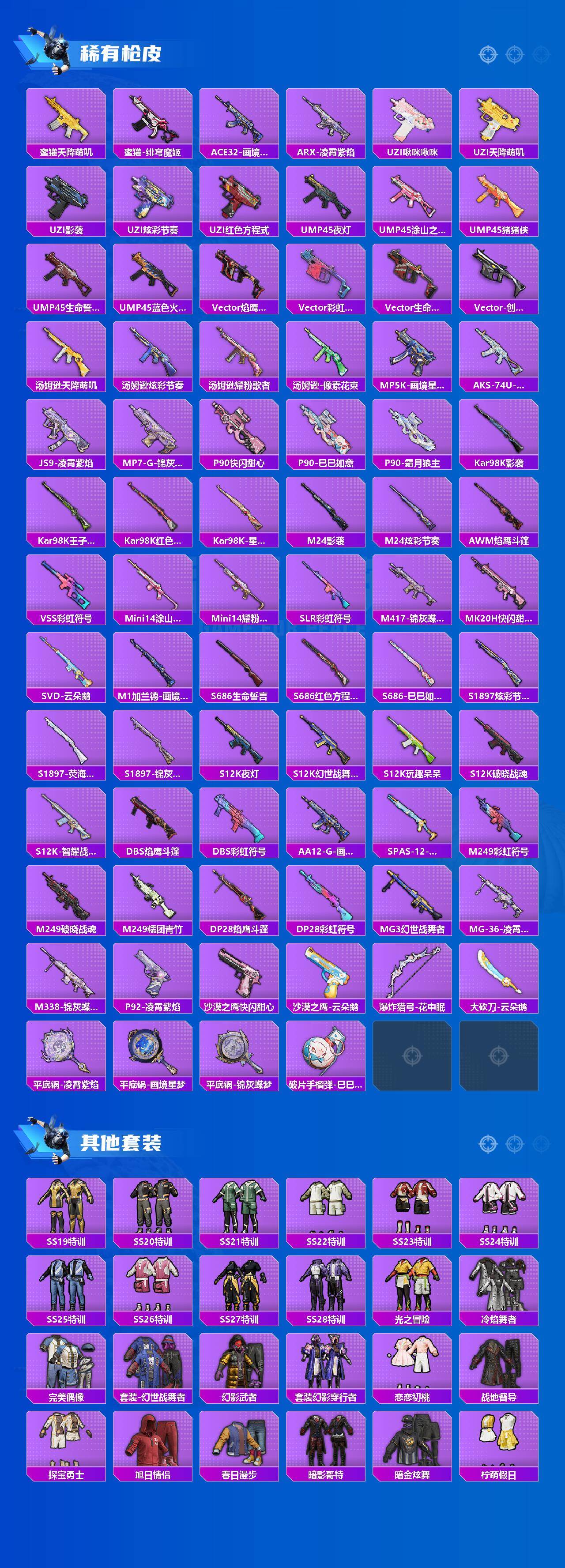 【粉色枪皮等级】:蜜獾-荧海星豚(七级),UMP45-萌骑冒险(五级),AKS-74U-森灵之息(五级),Kar98K-巳巳如意(五级),Mk14-福马献瑞(五级),DP-28-豹影疾电(五级),MG3-洛神天依(七级),MG-36-沧焰双生(五级)