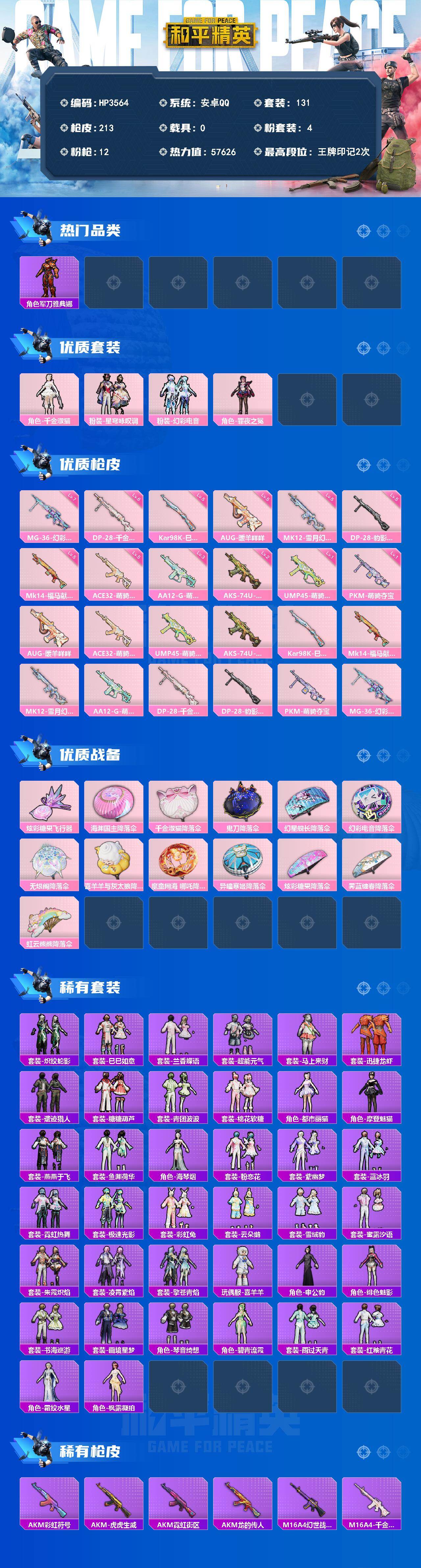 【HP3564】131套装/枪械12/装备267/战备134/王牌印记2/热力值57626/五级AUG-暖羊咩咩/五级ACE32-萌骑漫游/一级UMP45-萌骑冒险/二级AKS-74U-森灵之息/五级Kar98K-巳巳如意/五级Mk14-福马献瑞/五级MK12-雪月幻音/三级AA12-G-萌骑幻想/六级DP-28-千金淑猫/五级DP-28-豹影疾电/一级PKM-萌骑夺宝/七级MG-36-幻彩电音/角色-军刀雅典娜/角色-千金淑猫/粉装-星穹咏叹调/粉装-幻彩电音/角色-罪夜之冕/AUG-暖羊咩咩