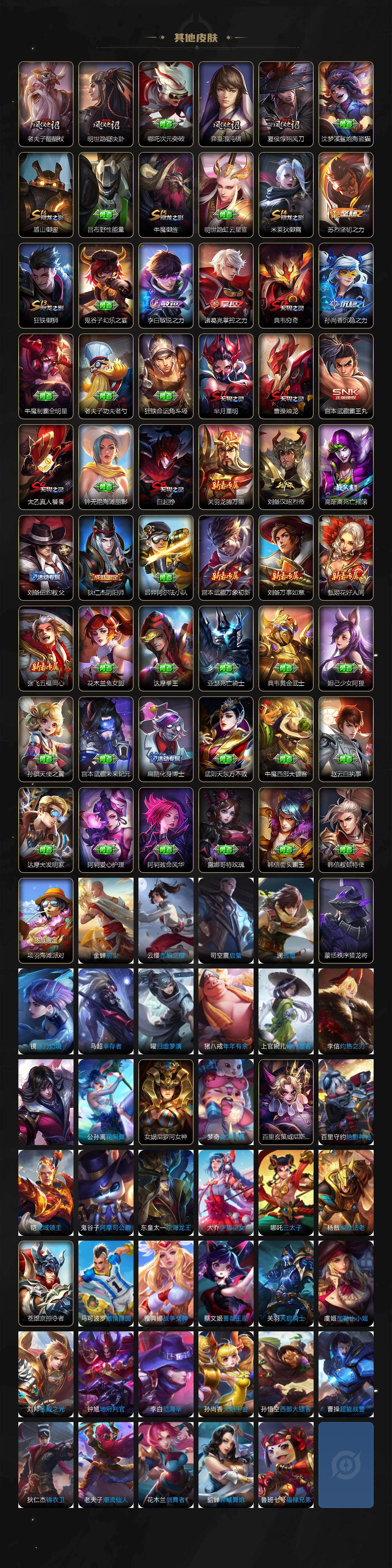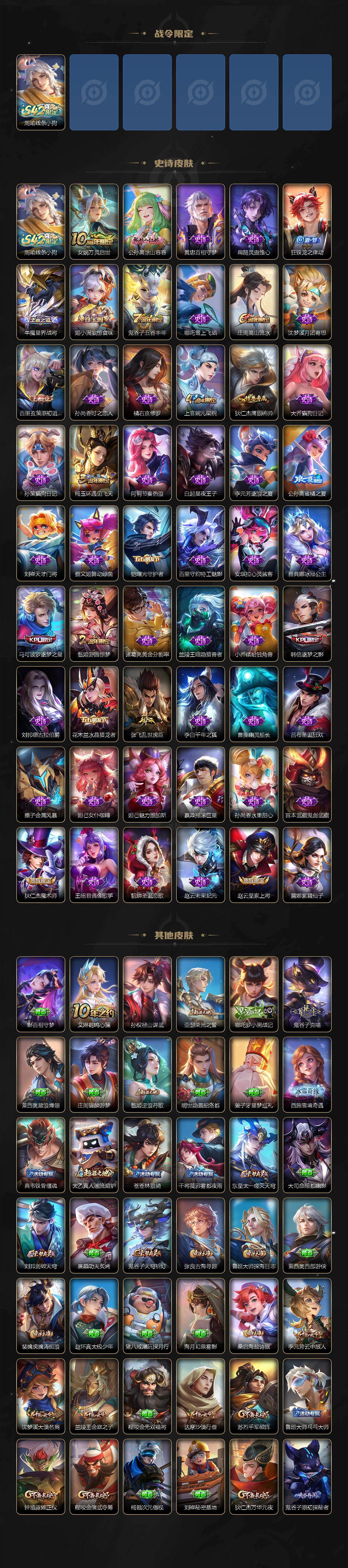 【限定皮肤】:白起狰,狄仁杰阴阳师,赵云皇家上将,庄周高山流水,高渐离死亡摇滚,芈月重明,夏侯惇朔风刀,甄姬游园惊梦,曹操烛龙,典韦穷奇,马可波罗逐梦之星,狄仁杰魔术师