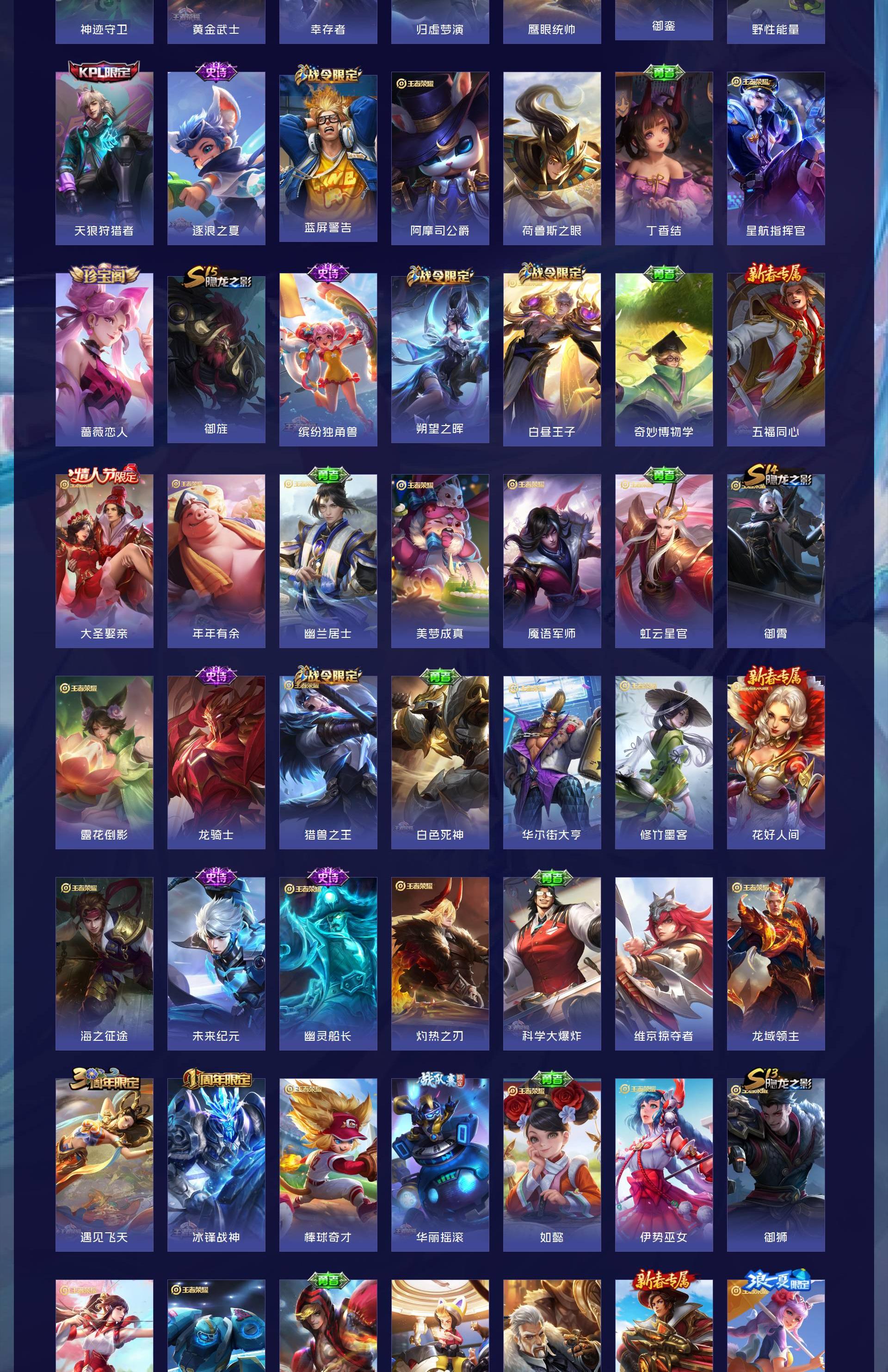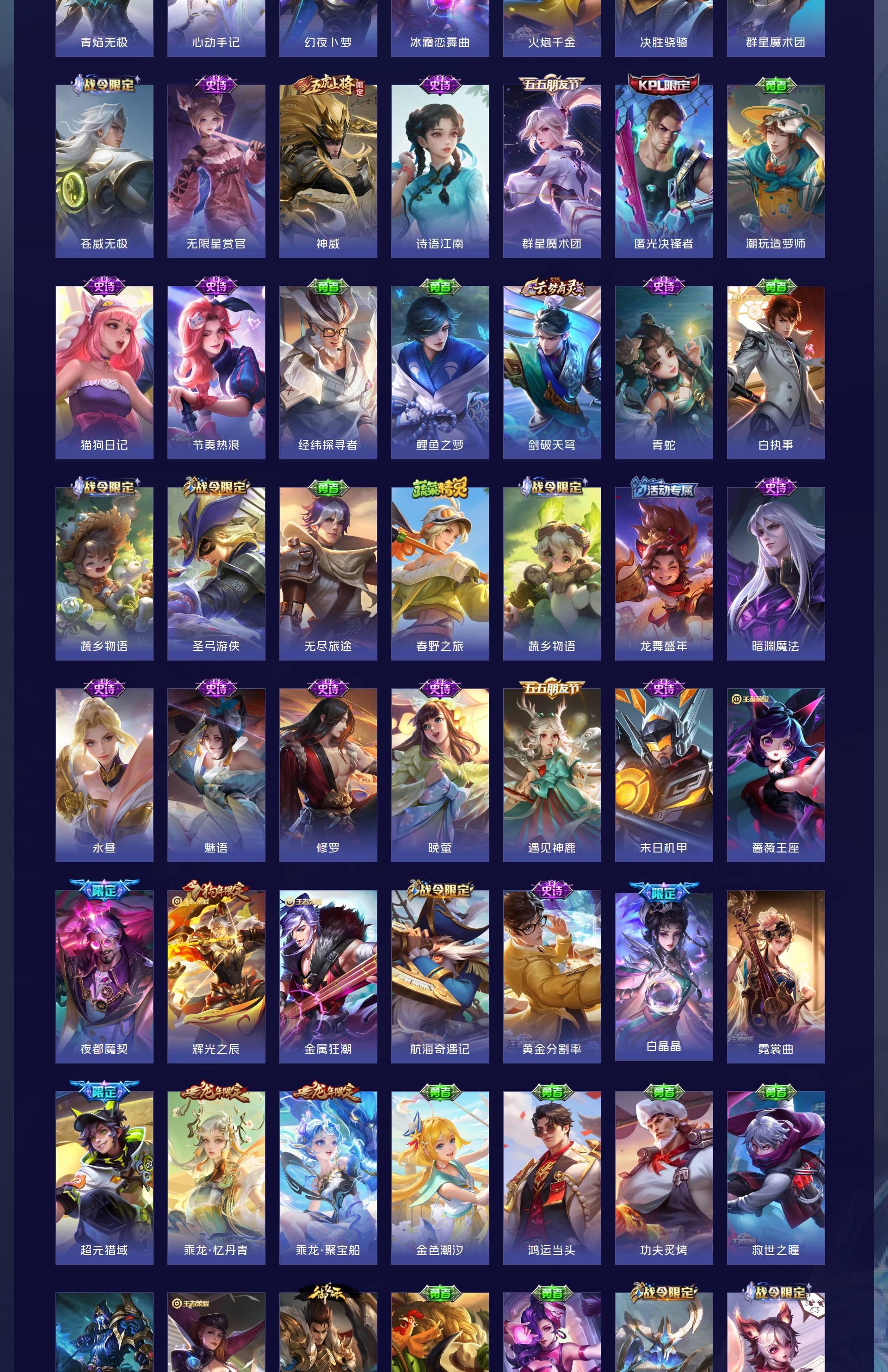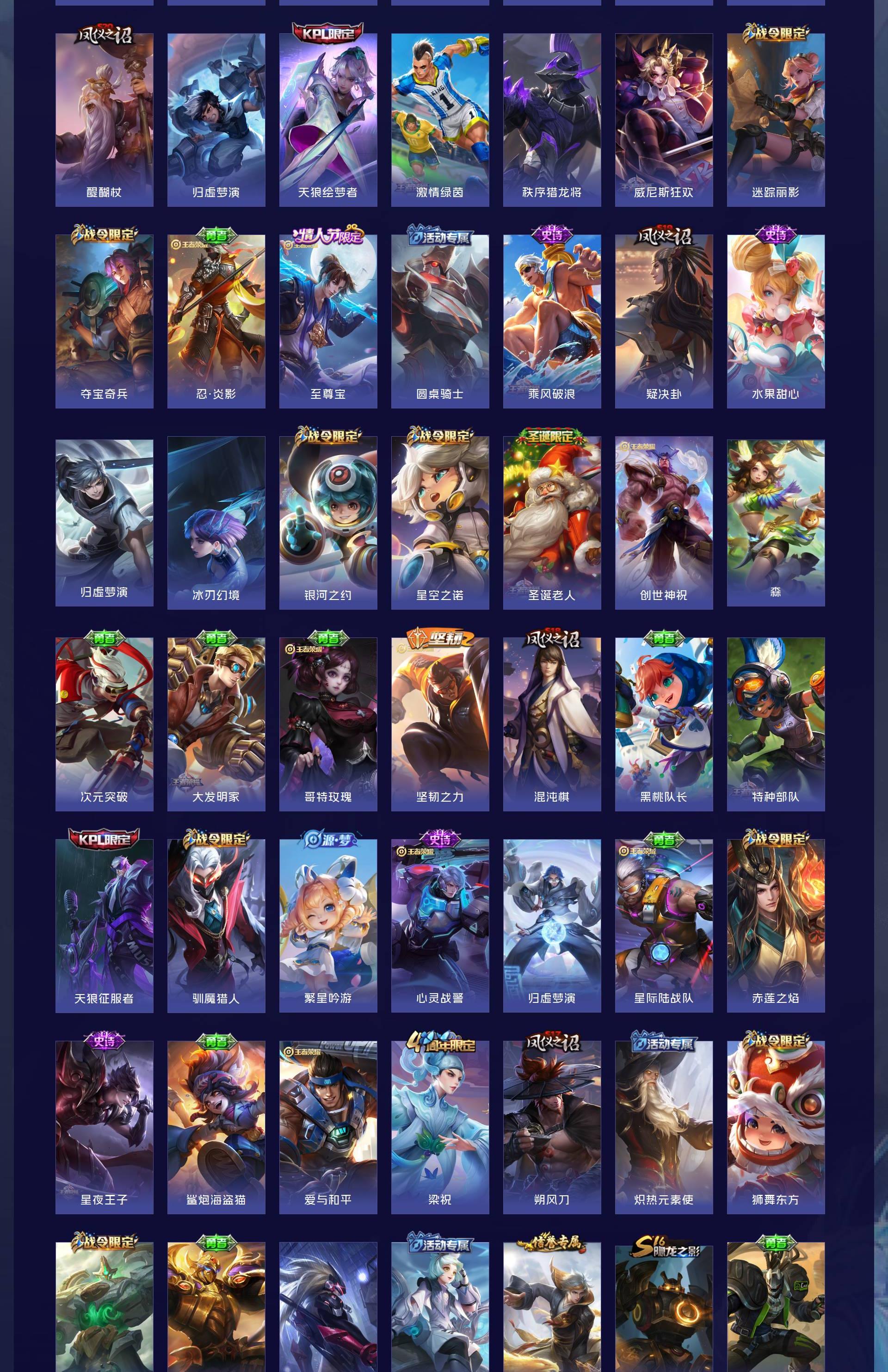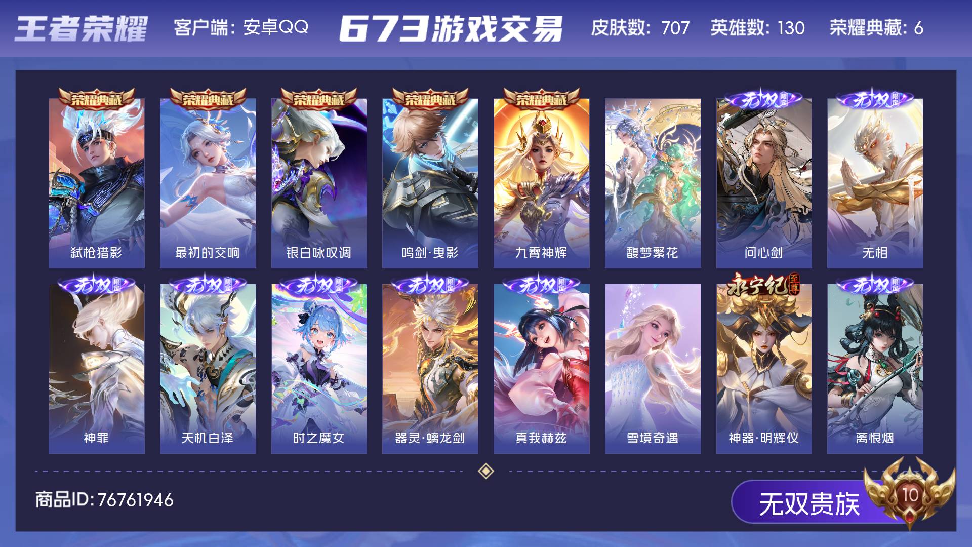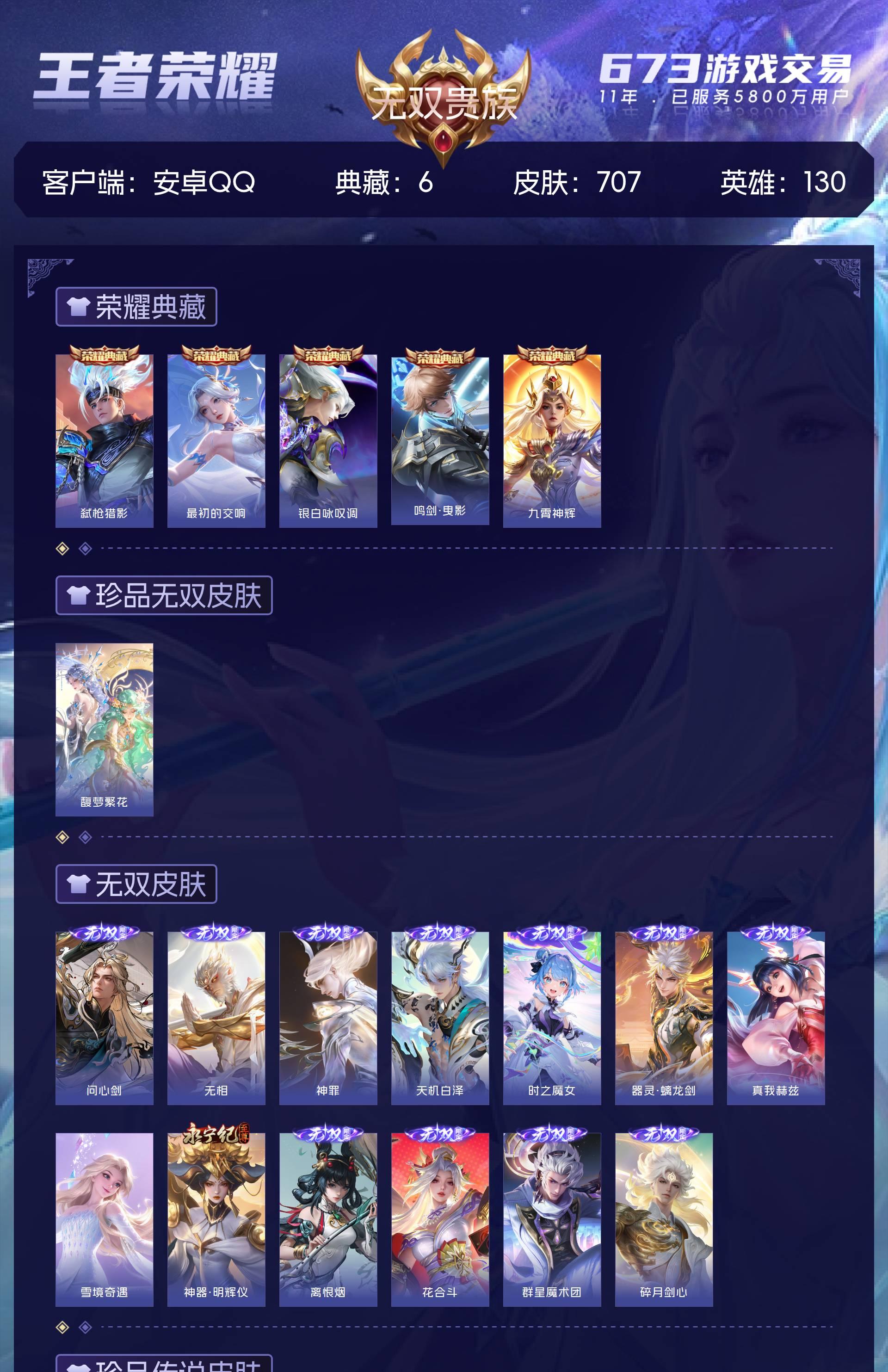 无双贵族 皮肤707 英雄130 至尊星耀 荣耀典藏6 珍品无双1 无双皮肤13 珍品传说10 星传说4 传说124