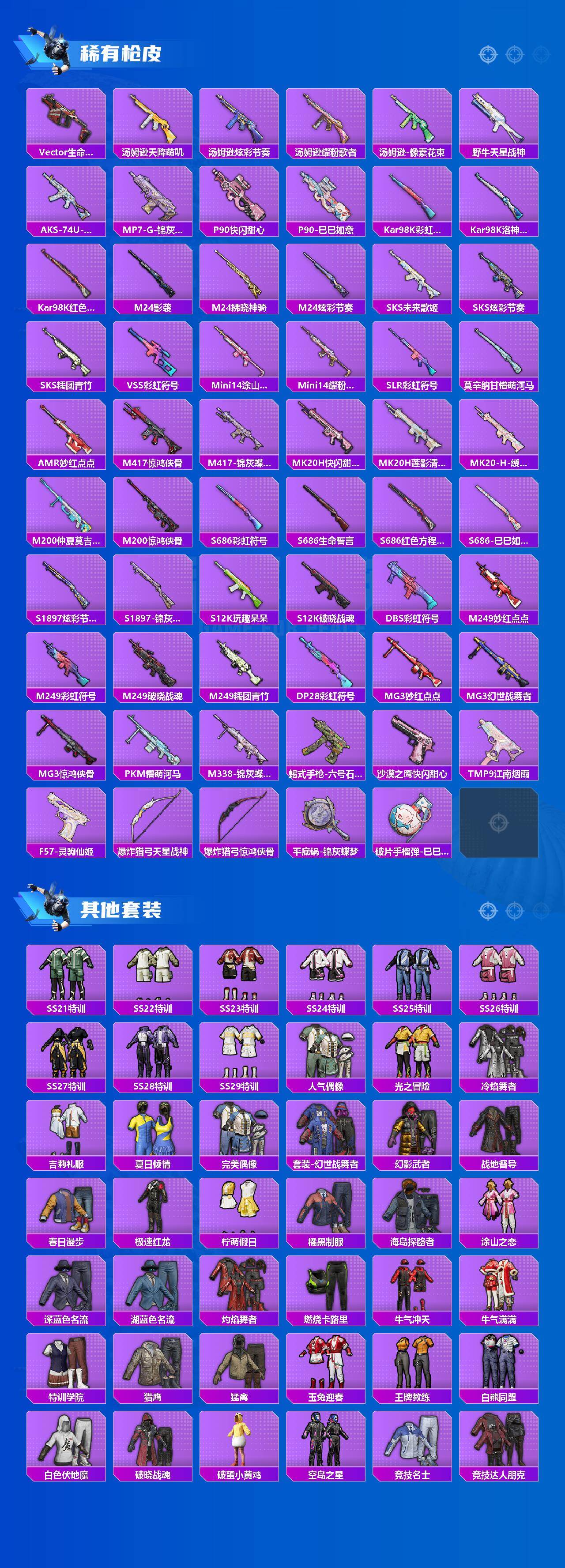【粉色枪皮等级】:AKM-绿萝繁花(五级),ACE32-萌骑漫游(二级),UMP45-萌骑冒险(三级),Kar98K-巳巳如意(五级),Mk14-福马献瑞(五级),AA12-G-萌骑幻想(一级)