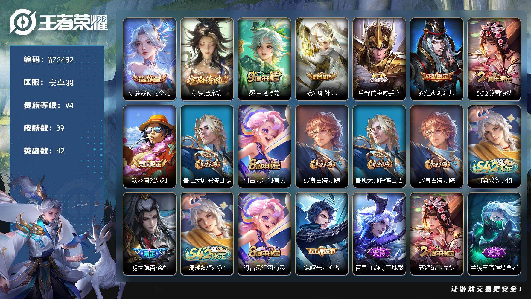 【秒换绑】安卓Q-V4-最强王者段位-42英雄-39皮肤-1典藏皮肤-1珍品传