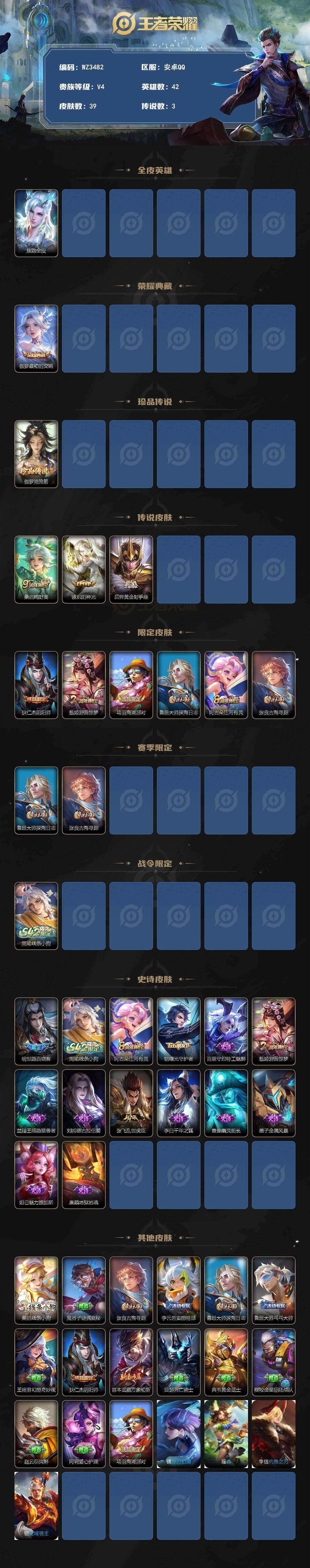 【秒换绑】安卓Q-V4-最强王者段位-42英雄-39皮肤-1典藏皮肤-1珍品传说-3传说-13史诗