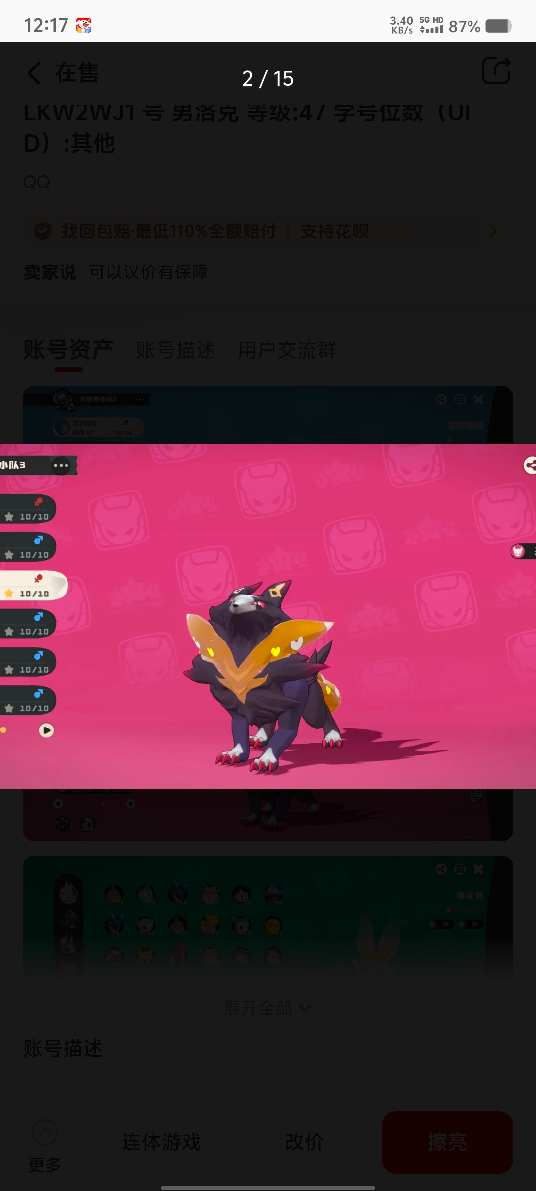 通过App,与卖家商议价格及保险,并向卖家索要账号最新截图,确认后下单购买。