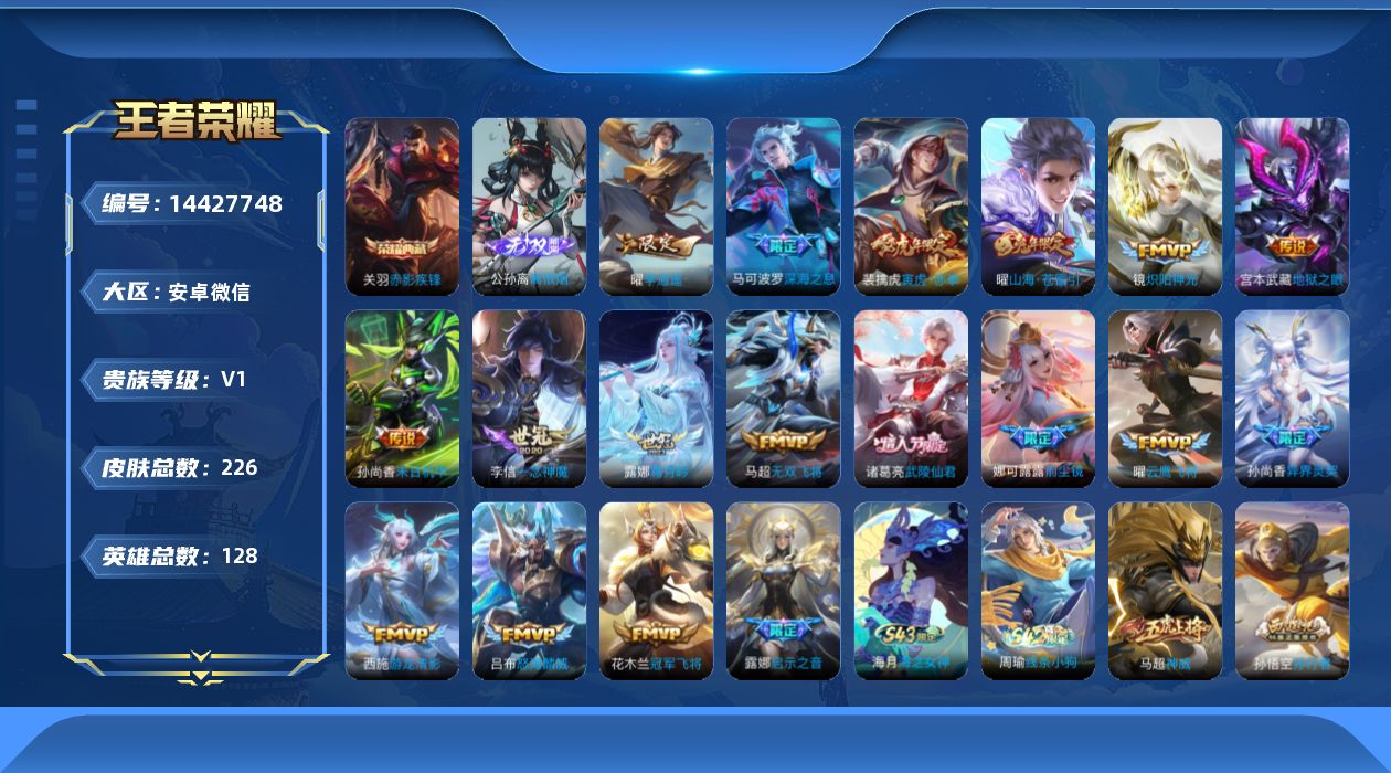 实名: 可修改 性别: 男号 贵族等级: V1 英雄数: 128 皮肤数: 226 荣耀水晶: 赤影