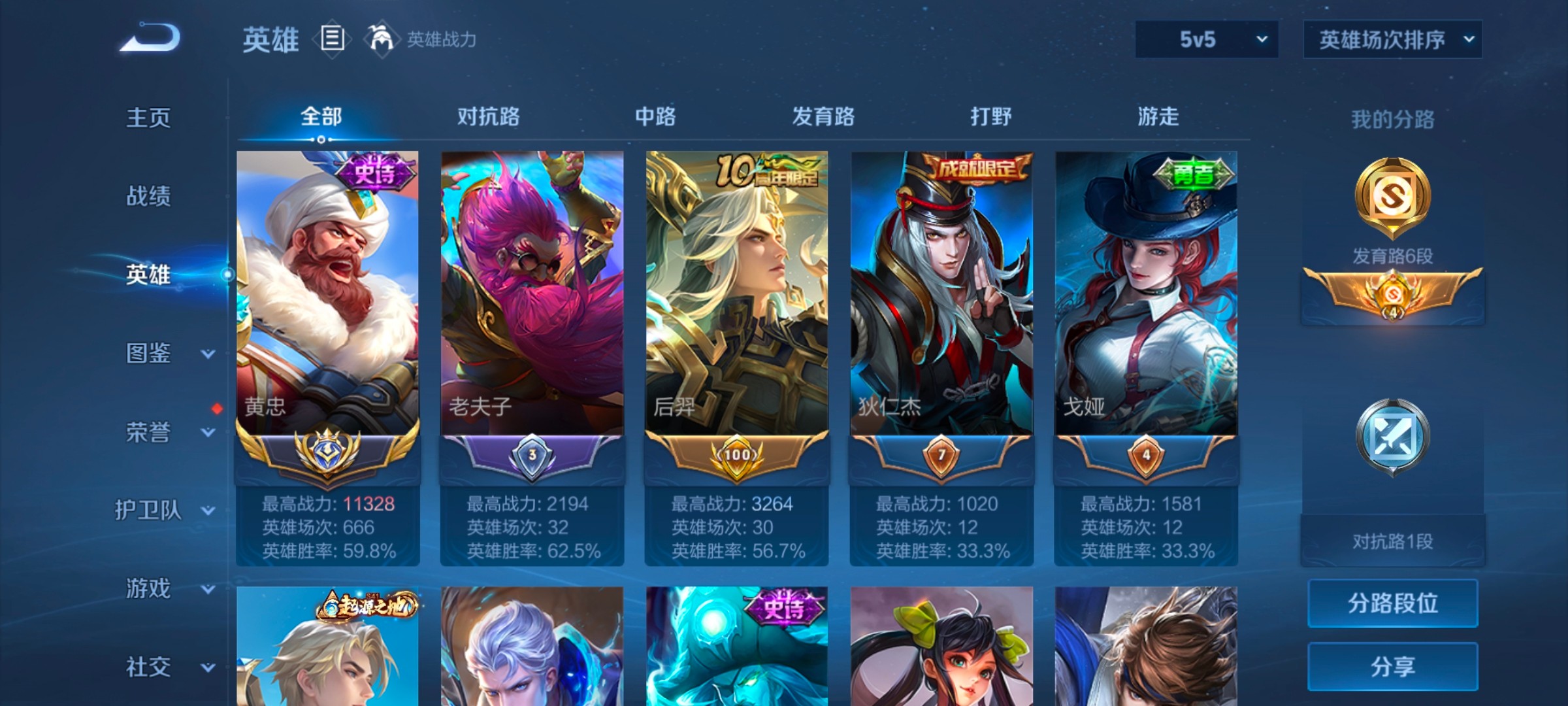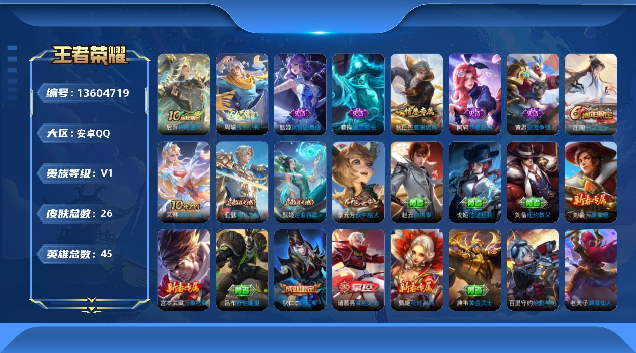 实名: 可修改 性别: 男号 贵族等级: V1 英雄数: 45 皮肤数: 26 传说皮: 神树通天