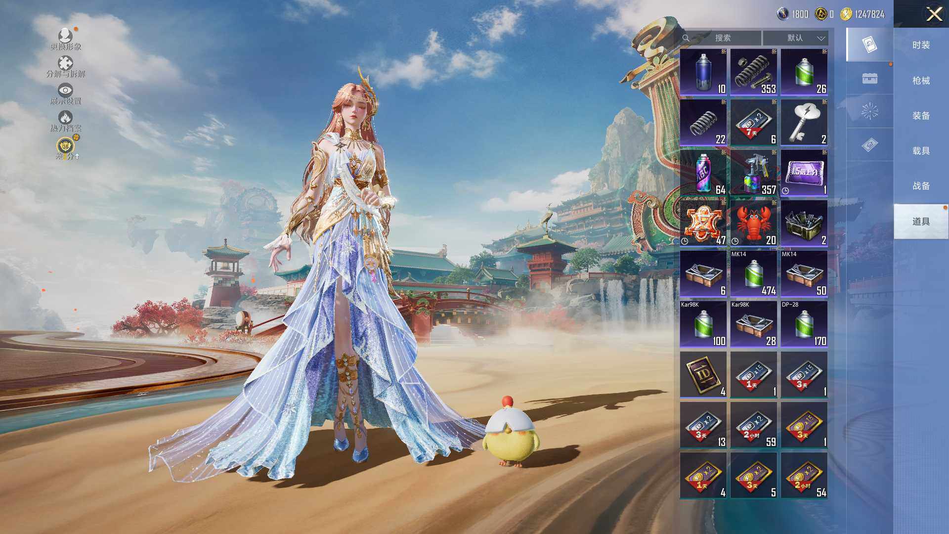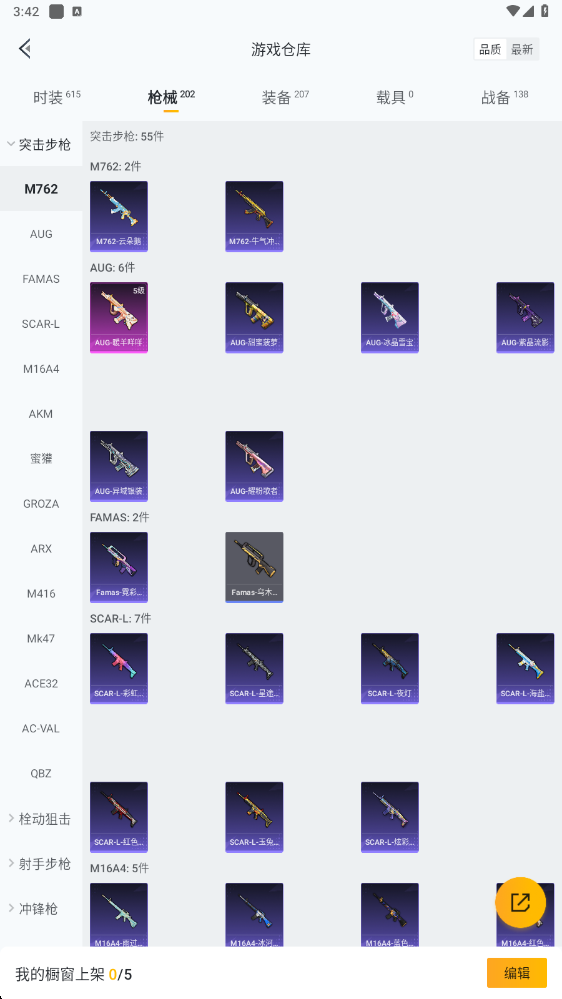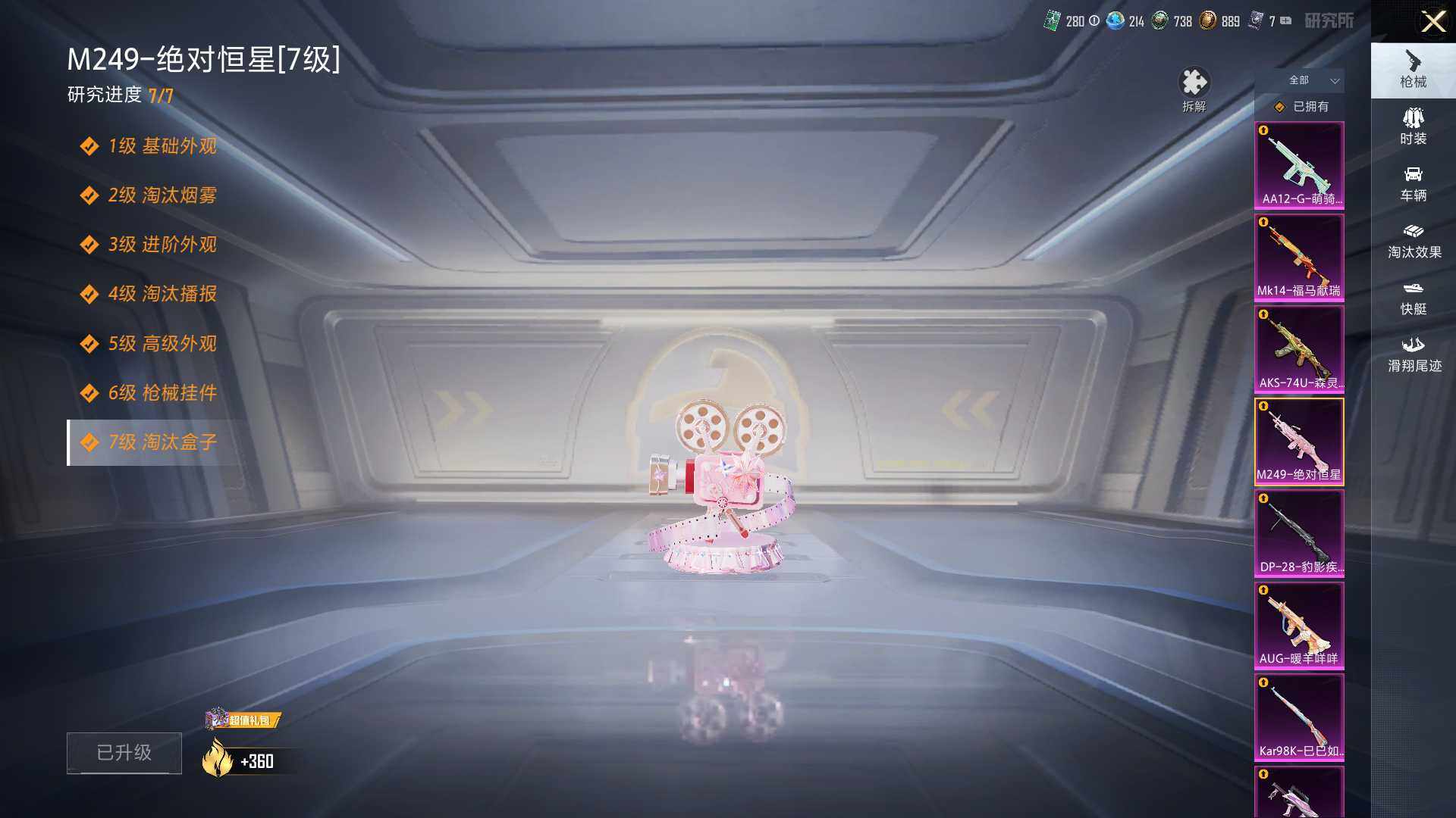 【粉色枪皮等级】:GROZA-镜光银凌(五级),AUG-暖羊咩咩(五级),AKS-74U-森灵之息(五级),Kar98K-巳巳如意(五级),Mk