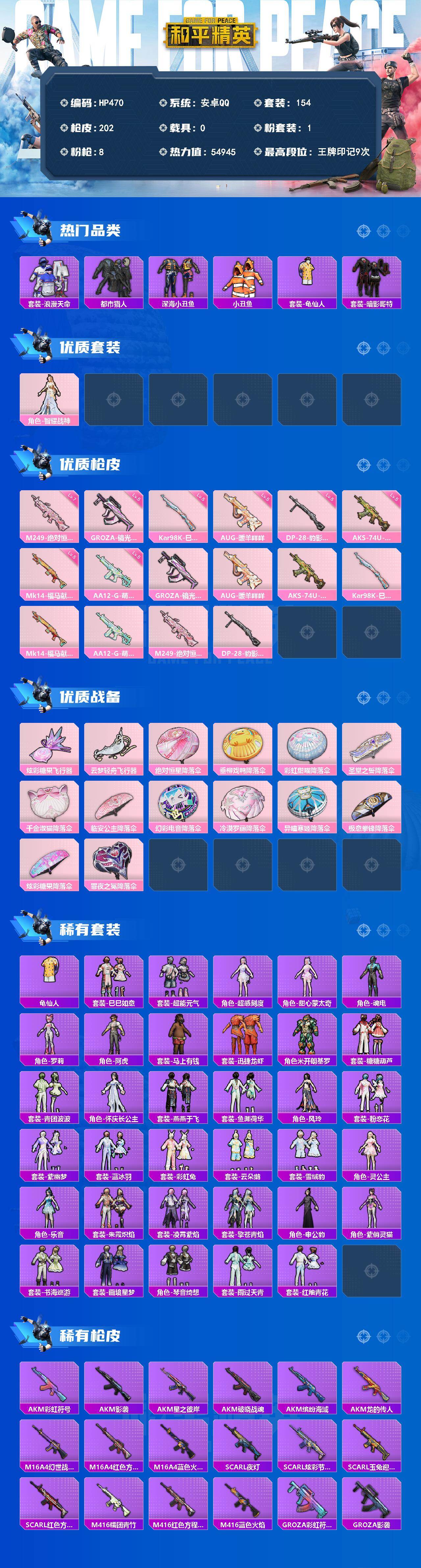 【秒换绑】安卓 手Q-1粉装-8特效枪-0载具-2粉色飞行器-54945热力值-9王牌印记-154套装-202枪皮