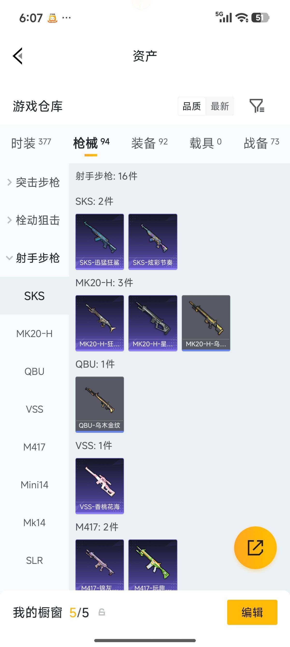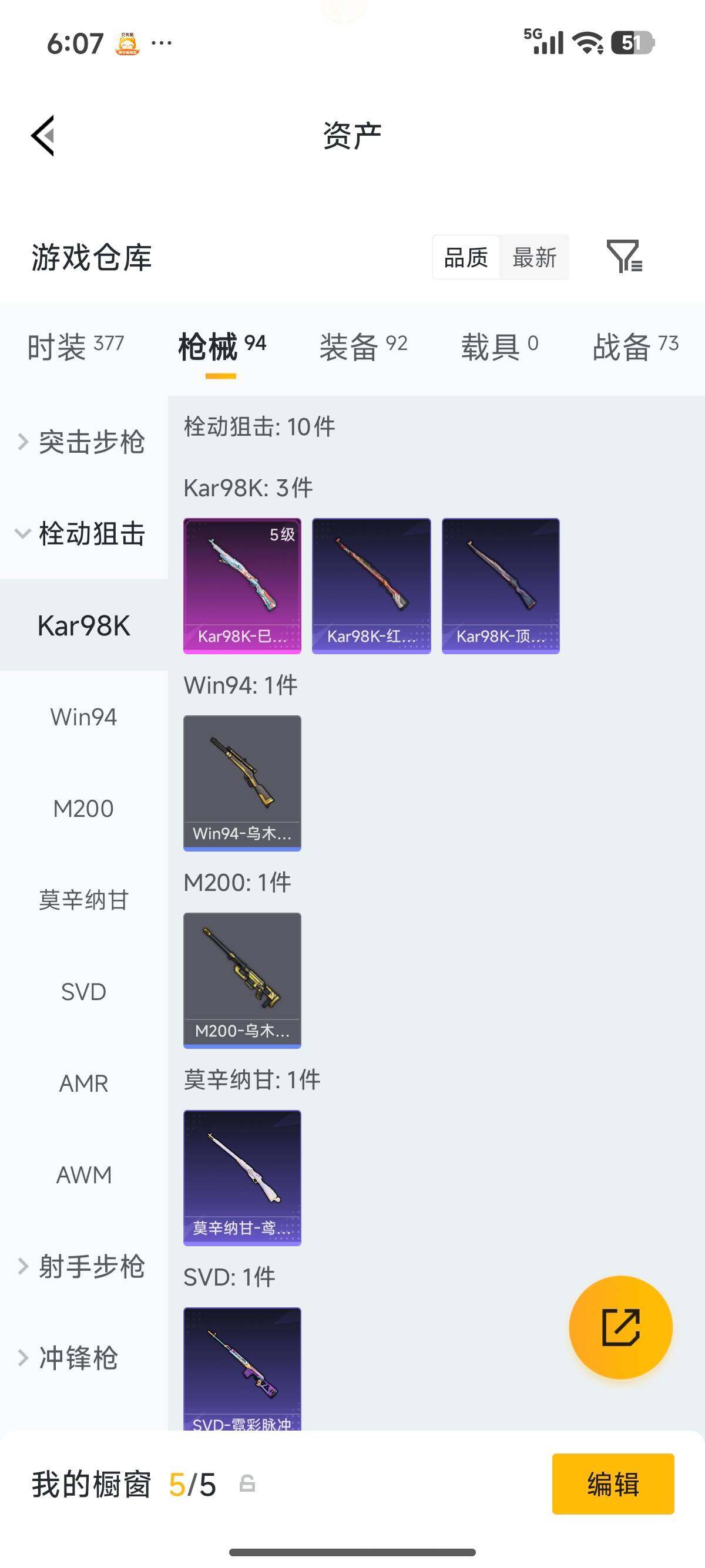 时装数: 377 枪械数: 94 战备数: 74 热门装扮: 鹰眼刺客,都市猎人,派对舞王 稀有枪皮: UMP45-萌骑冒险(五级),Kar98K-巳巳如意(五级),DP-28-豹影疾电(五级)