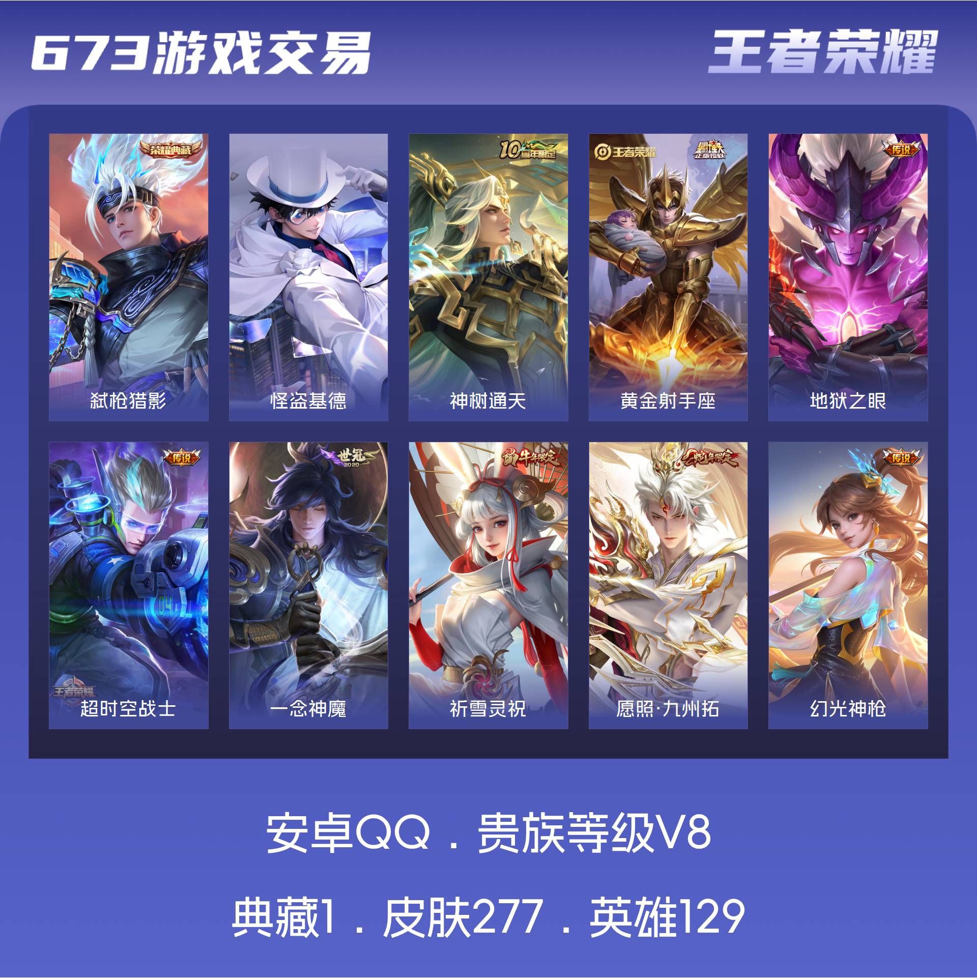 V8 皮肤277 英雄129 永恒钻石 荣耀典藏1 珍品传说1 传说17