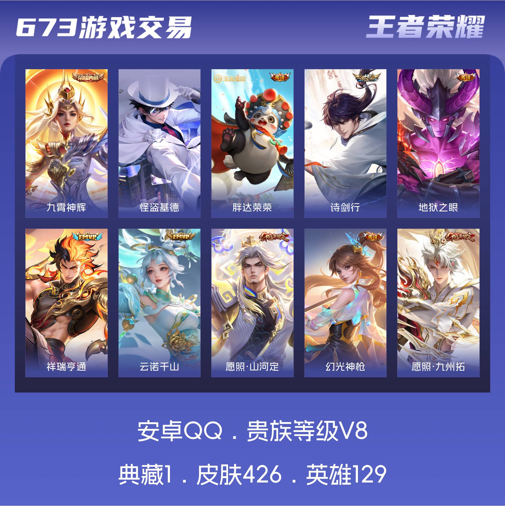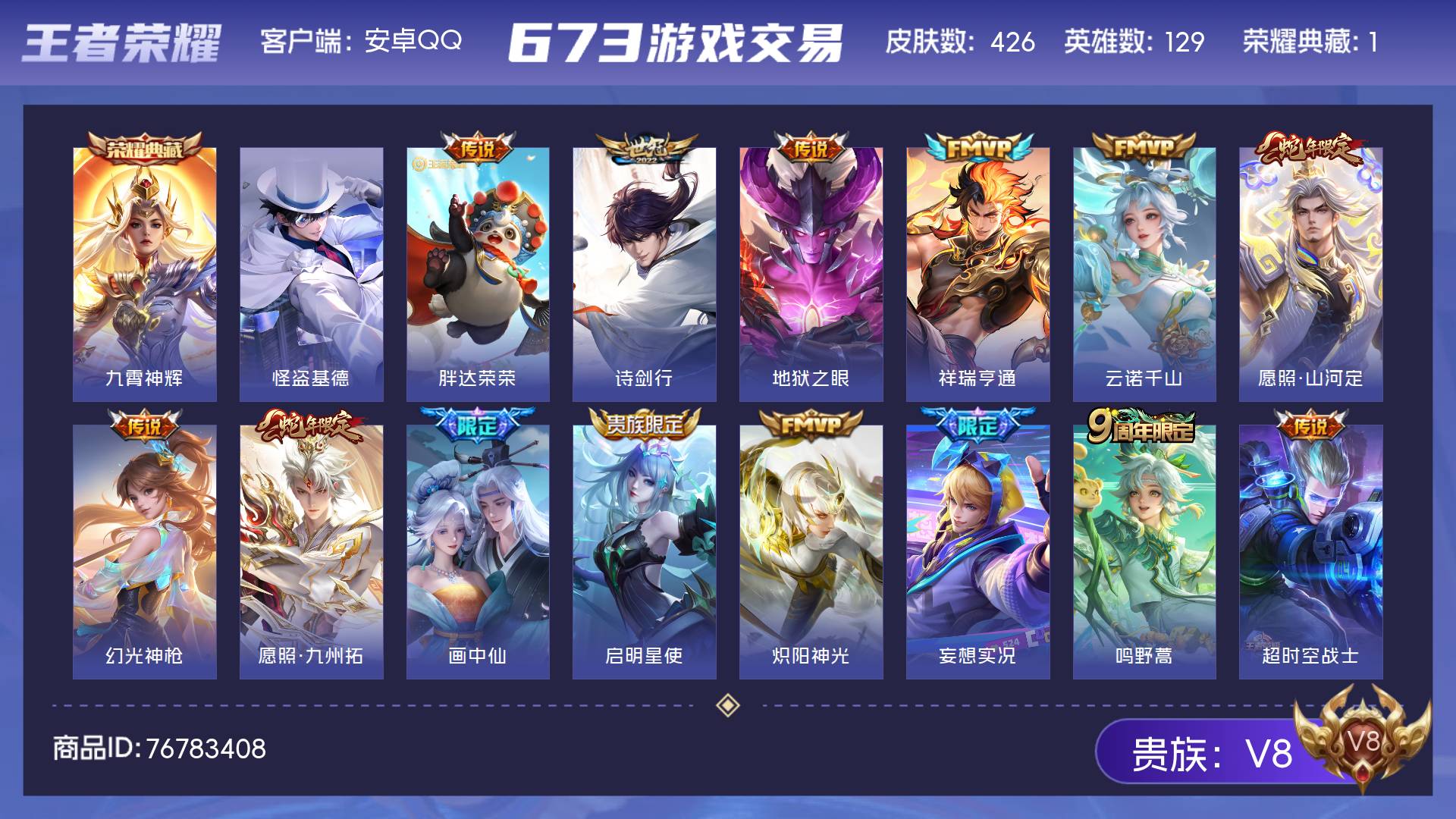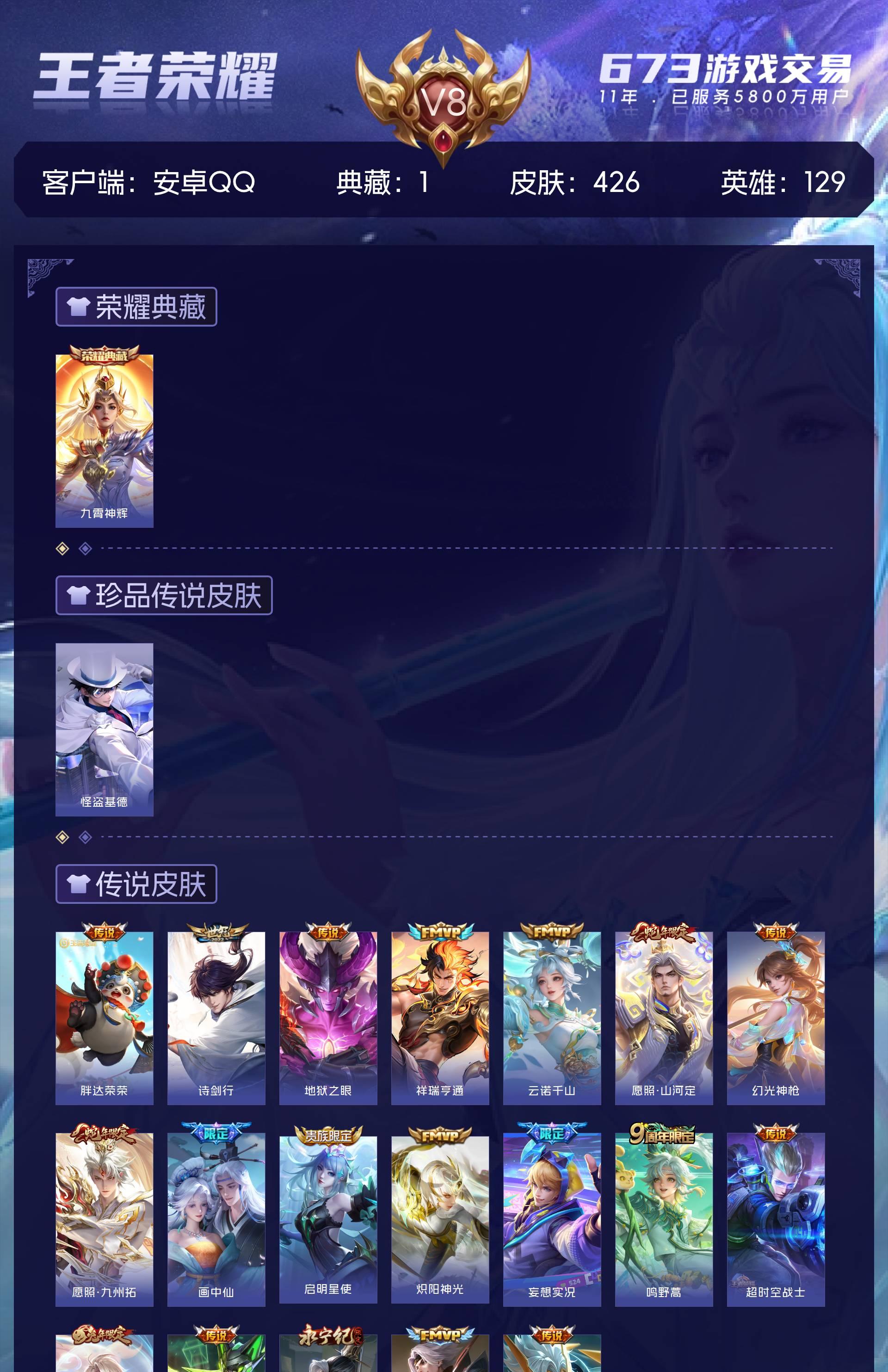 V8 皮肤426 英雄129 至尊星耀 荣耀典藏1 珍品传说1 传说19