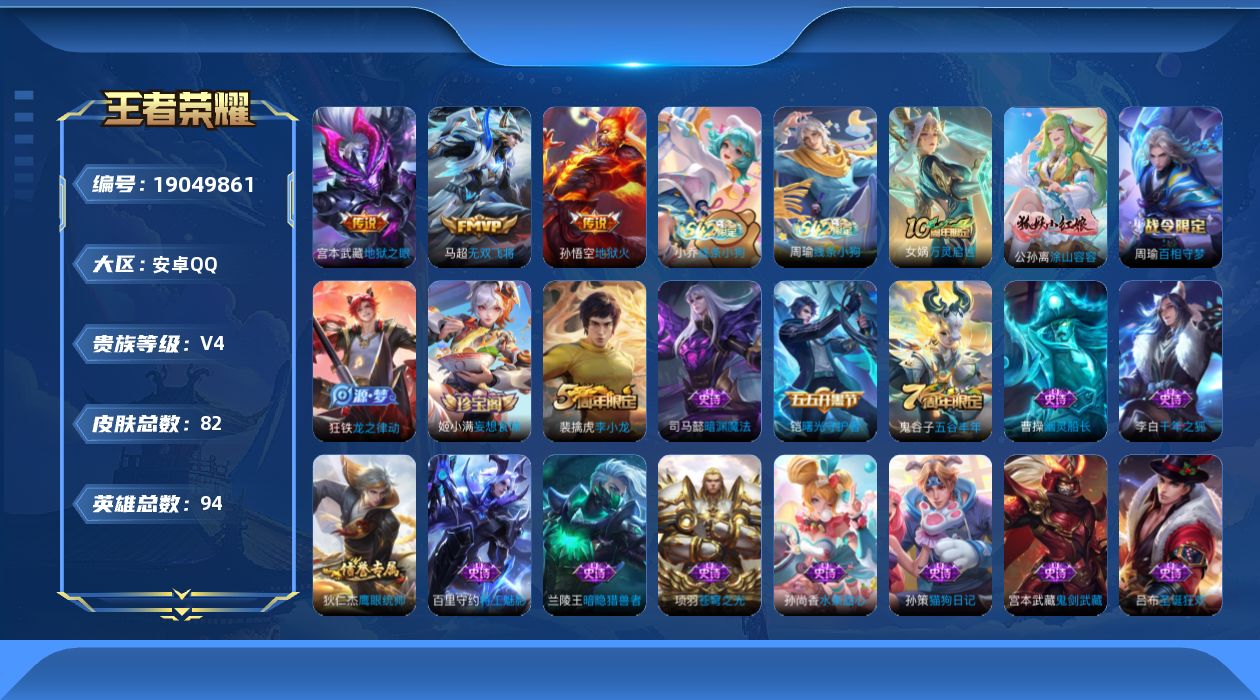 V4 3传说 94英雄 82皮肤 可二次 可修改实名 男号