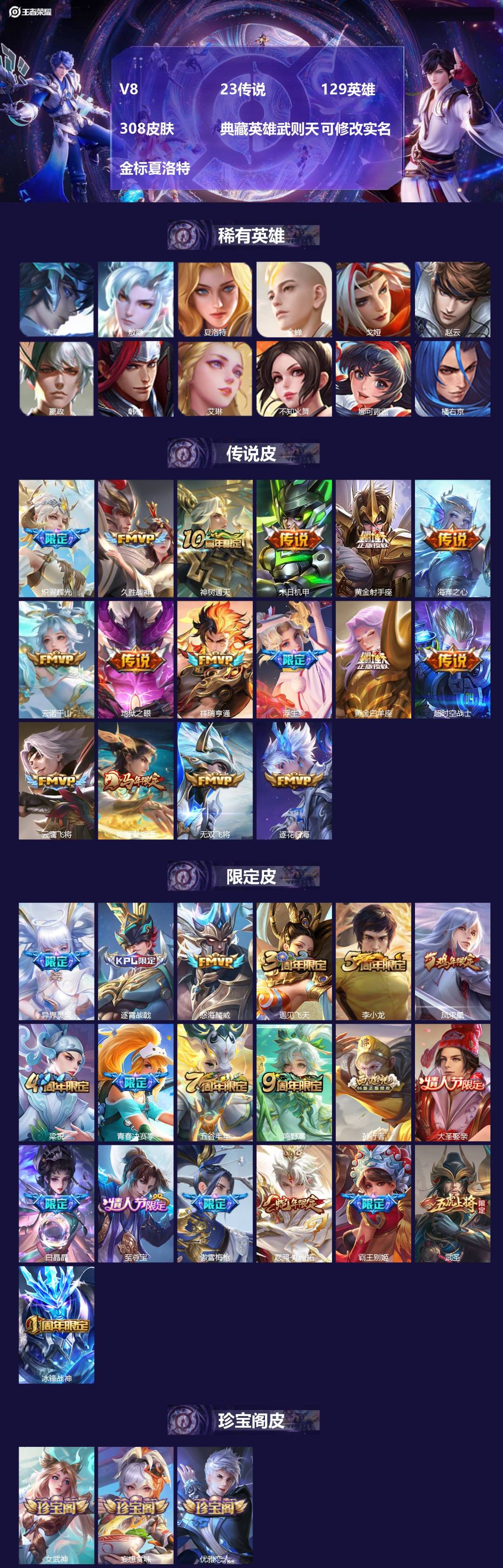 [19050313]V8 23传说 129英雄 308皮肤 典藏英雄武则天 可修改实名 金标夏洛特
