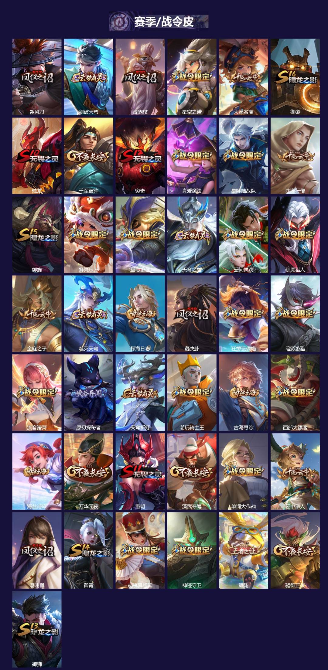 【传说皮】神骥·赴朔漠,神树通天,云诺千山,祥瑞亨通,黄金射手座,黄金白羊座,海洋之心,地狱之眼,末日机甲-孙尚香(绿蚂蚱),久胜战神,云鹰飞将(小将军),无双飞将,超时空战