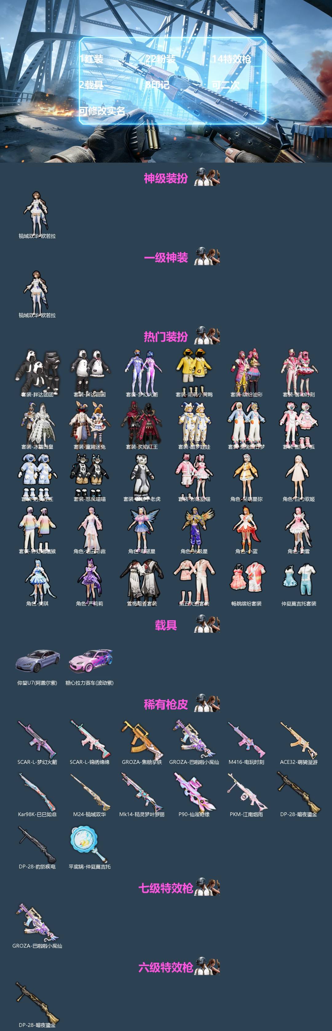 1红装 22粉装 14特效枪 2载具 8印记 可二次 可修改实名