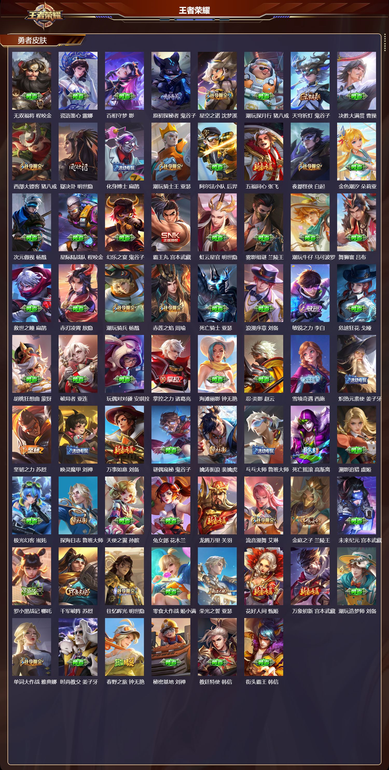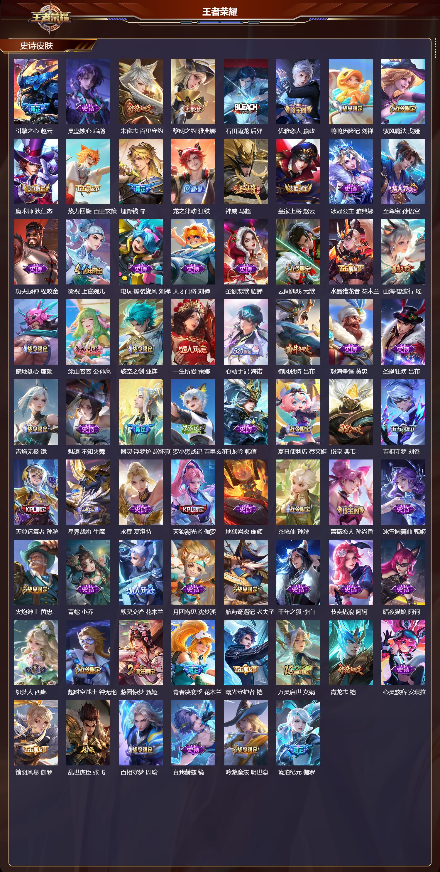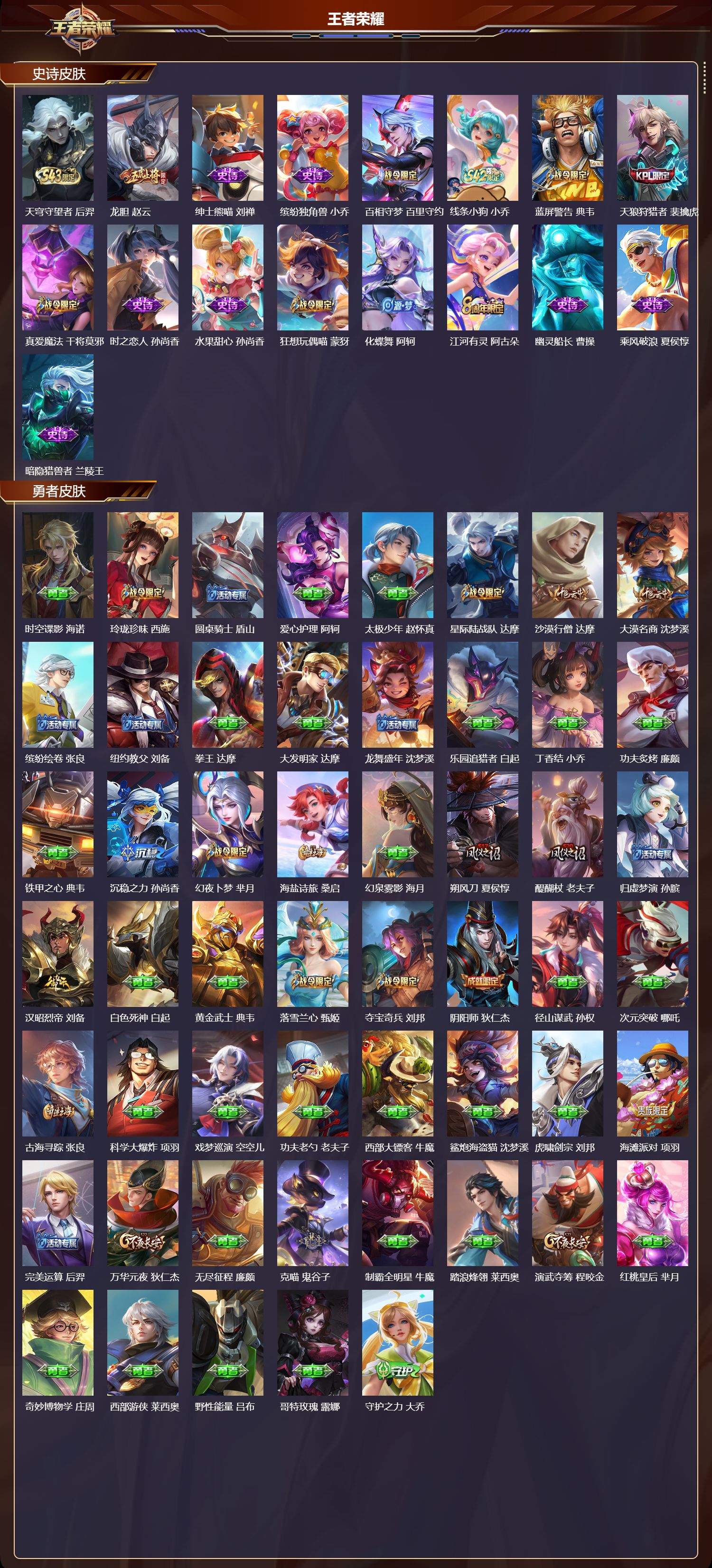 安卓QQ/至尊星耀/487皮肤/129英雄/3典藏/0珍品无双/5无双/1珍品传说/44传说/174史诗/9稀有英雄【1 珍品传说】器灵·落星盏 嫦娥,【3 典藏皮肤】鸣剑·曳影 李白,银白咏叹调 铠,星域神启 诸葛亮,【5 无双皮肤】问心剑 李信,碎月剑心 李白,花合斗 不知火舞,神罪 铠,器灵·螭龙剑 曜,【44 传说皮肤】武圣 关羽,启明星使 虞姬,逐花归海 澜,时之祈愿 瑶,电玩·雷克斯