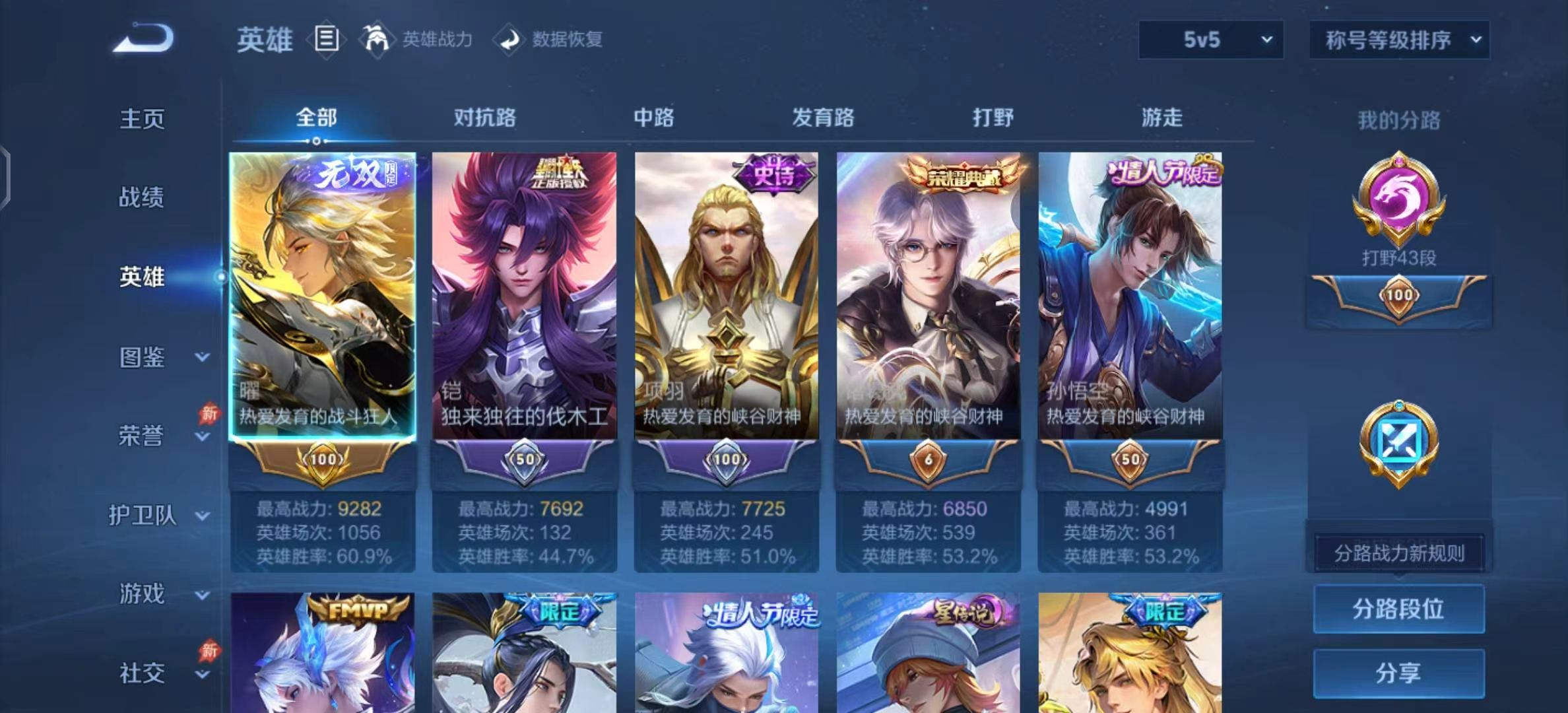 安卓QQ/至尊星耀/487皮肤/129英雄/3典藏/0珍品无双/5无双/1珍品传