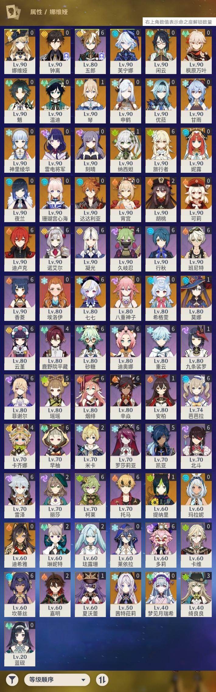 满命迪卢克,满命七七,2命胡桃,1命莫娜,1命纳西妲,1命琴,1命提纳里,0命魈,0命雷电将军,0命闲云,0命钟离,0命迪希雅,0命达达利亚,0命茜特菈莉,0命芙宁娜,0命神里绫华,0命申鹤,0命甘雨,0命珊瑚宫心海,0命玛拉妮,0命温迪,0命梦见月瑞希,0命枫原万叶,0命希格雯,0命宵宫,0命娜维娅,0命妮露,0命夜兰,0命可莉,0命刻晴,0命八重神子,0