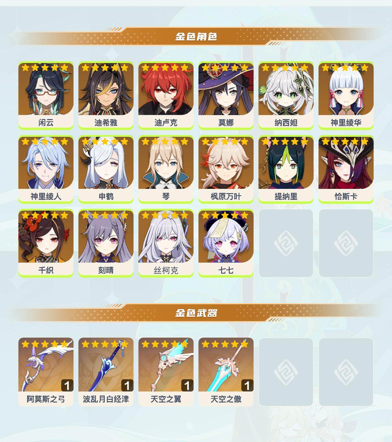 0命闲云,0命迪希雅,0命迪卢克,0命莫娜,0命纳西妲,0命神里绫华,0命神里绫人,0命申鹤,0命琴,0命枫原万叶,0命提纳里,0命恰斯卡,0命千织,0命刻晴,0命丝柯克,0命七七,精1阿莫斯之弓,精1波乱月白经津,精1天空之翼,精1天空之傲