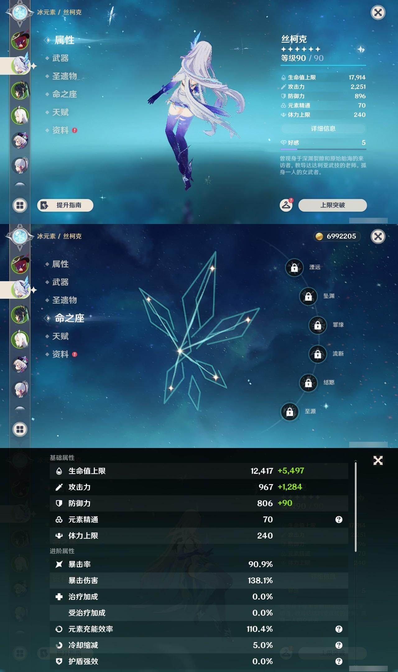 57级/20黄/男主/16个五星角色/4个五星武器