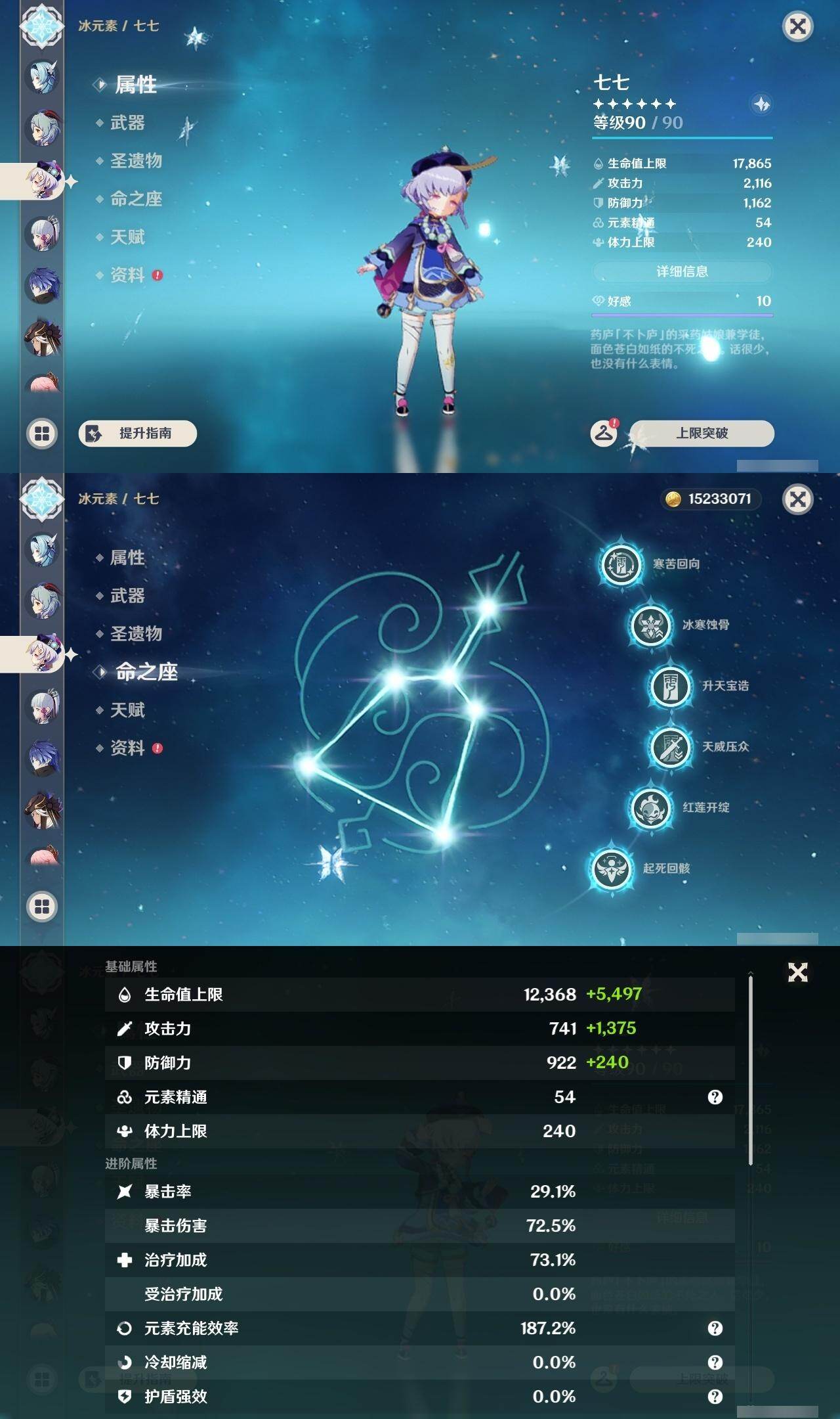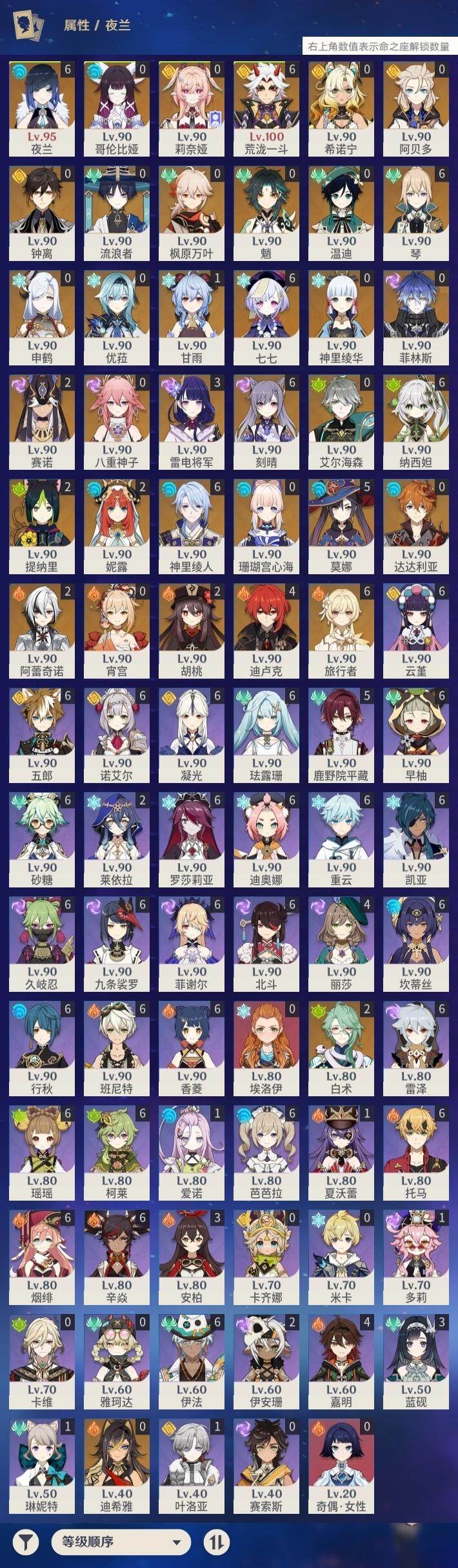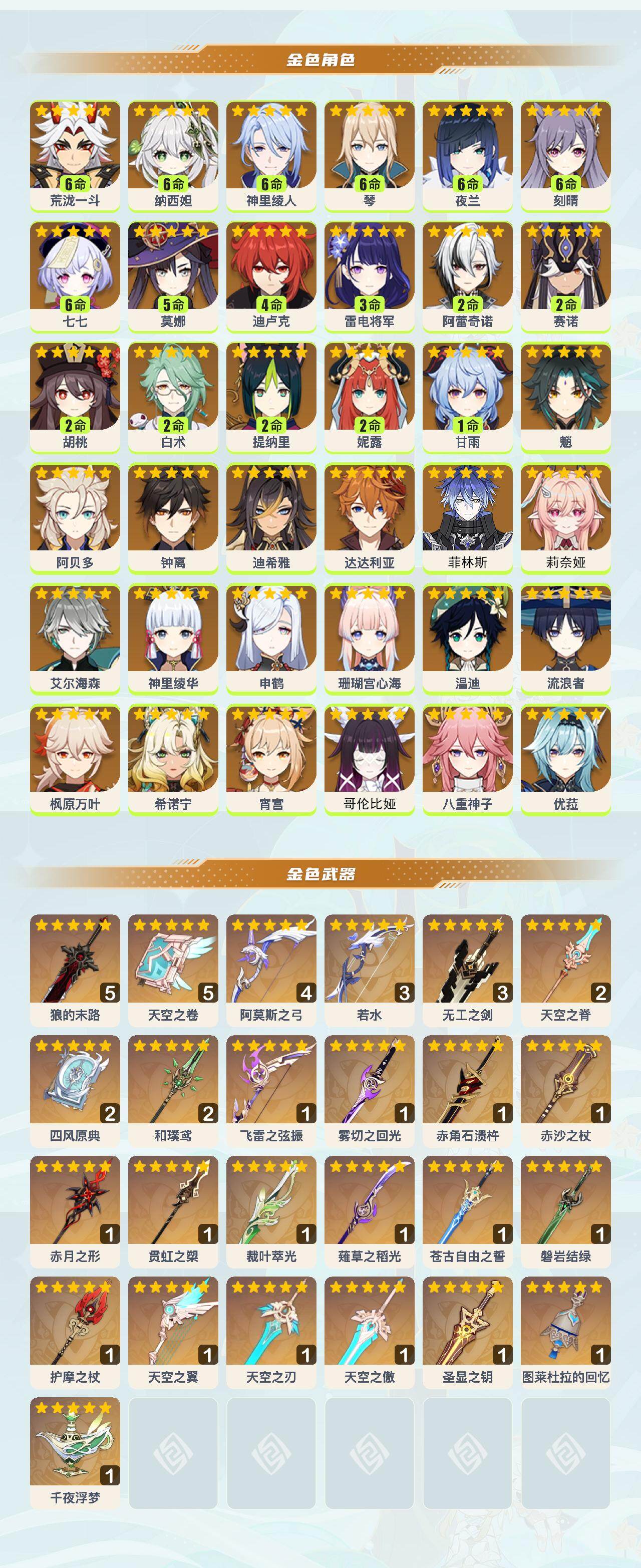 满命荒泷一斗,满命纳西妲,满命神里绫人,满命琴,满命夜兰,满命刻晴,满命七七,5命莫娜,4命迪卢克,3命雷电将军,2命阿蕾奇诺,2命赛诺,2命胡桃,2命白术,2命提纳里,2命妮露,1命甘雨,0命魈,0命阿贝多,0命钟离,0命迪希雅,0命达达利亚,0命菲林斯,0命莉奈娅,0命艾尔海森,0命神里绫华,0命申鹤,0命珊瑚宫心海,0命温迪,0命流浪