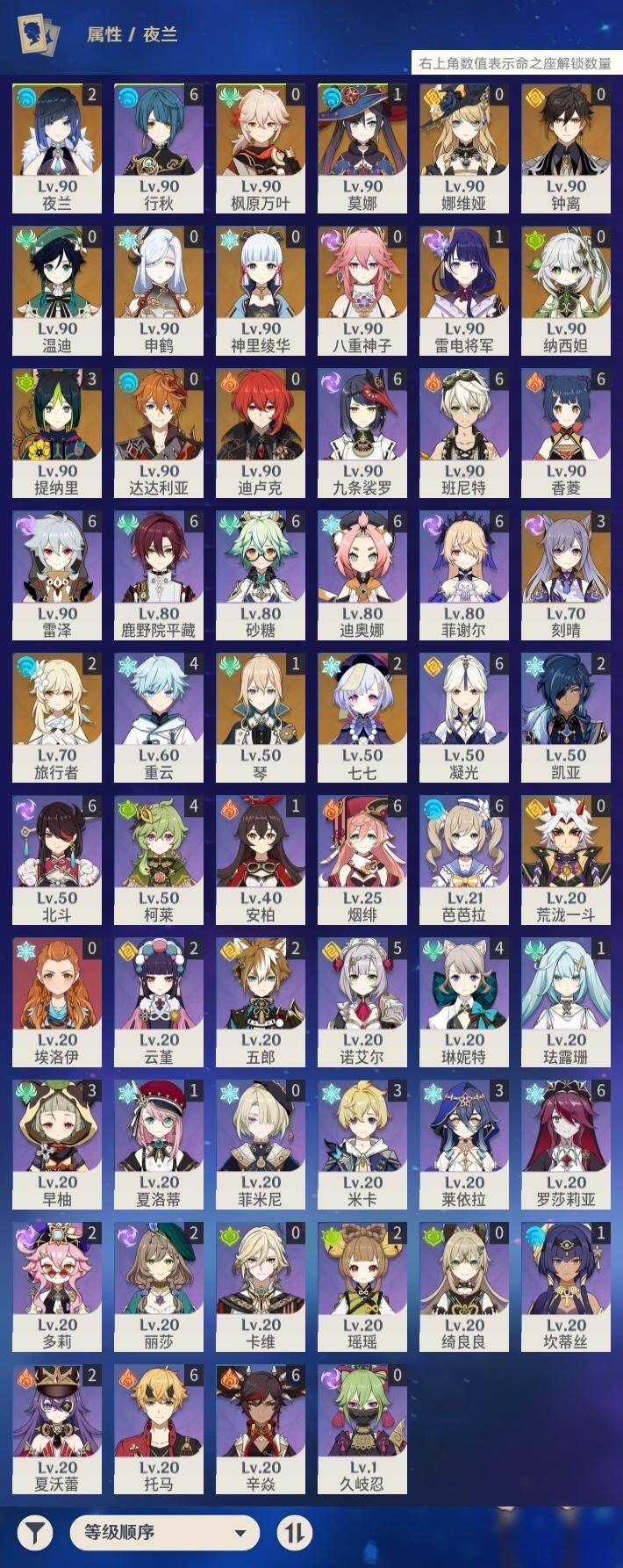 60级/45黄/女主/18个五星角色/13个五星武器3命提纳里,3命刻晴,2