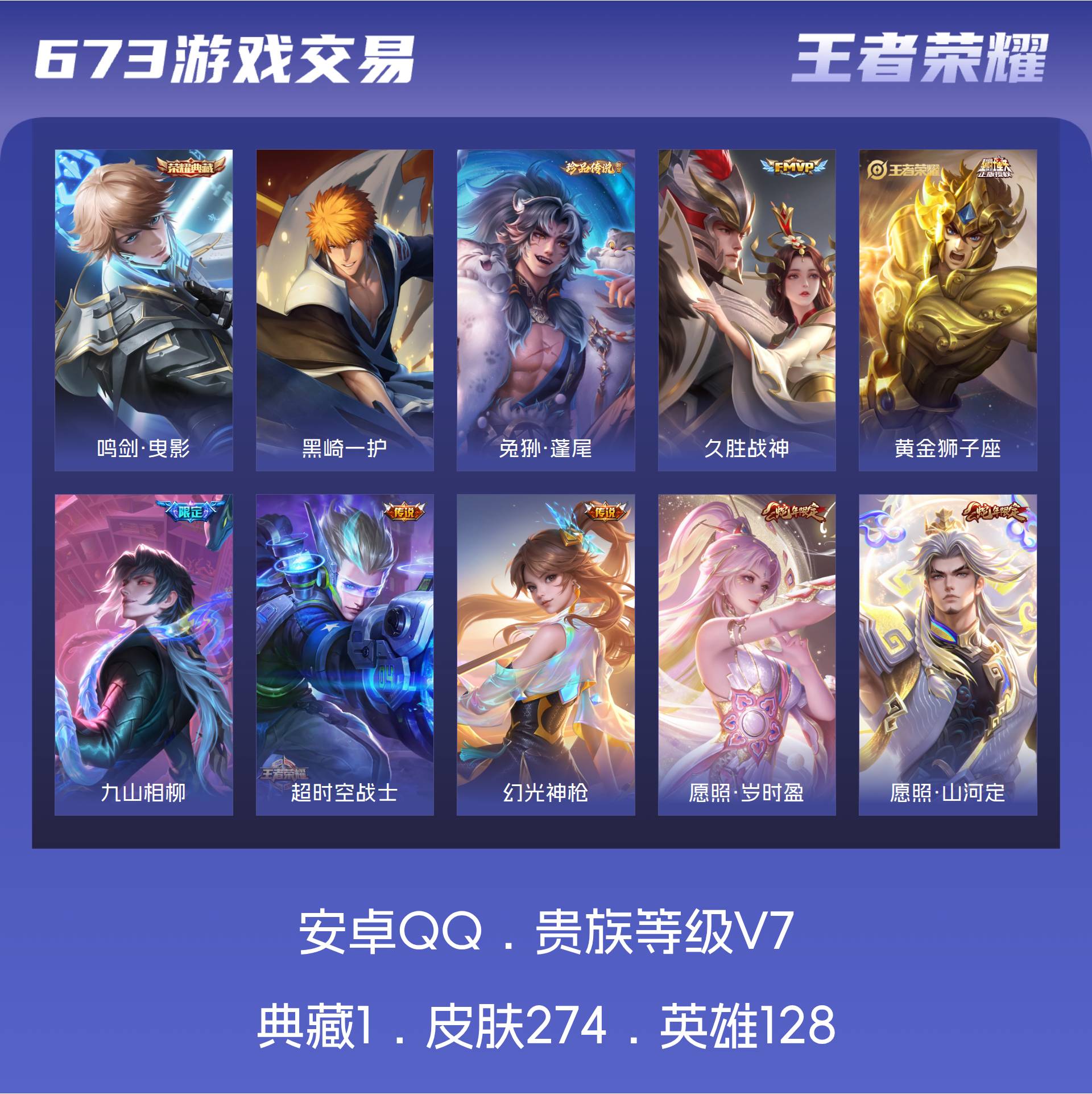 V7 皮肤274 英雄128 至尊星耀 荣耀典藏1 珍品传说2 星传说3 传说12