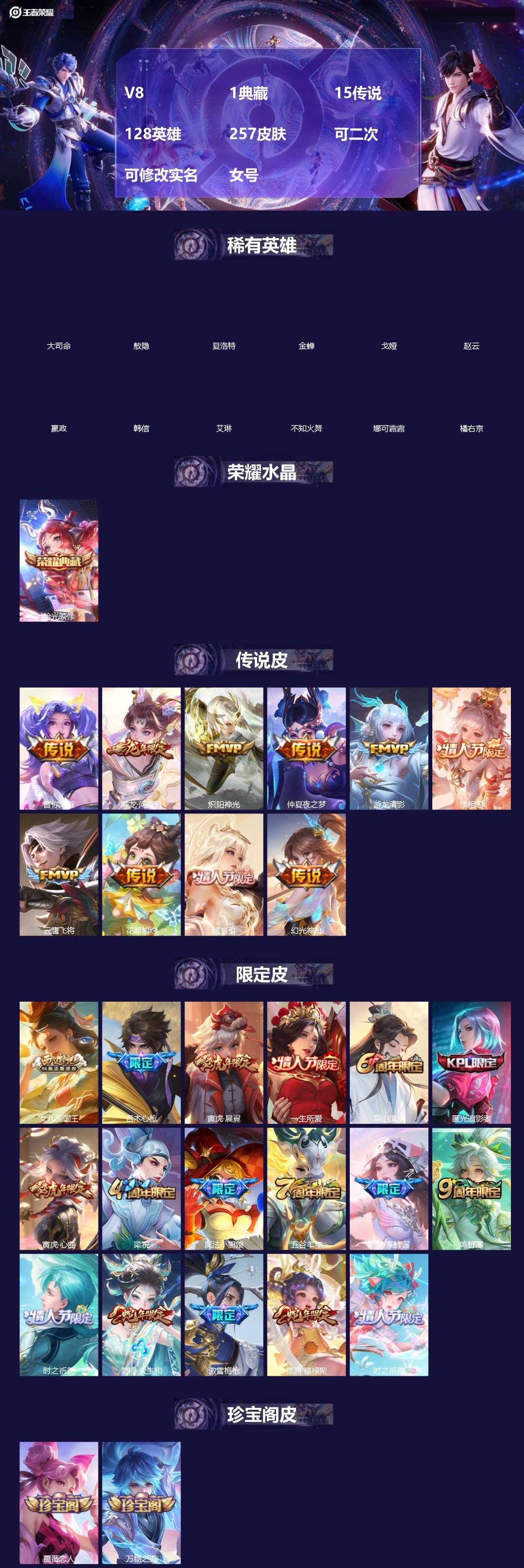 V8 1典藏 15传说 128英雄 257皮肤 可二次 可修改实名 女号