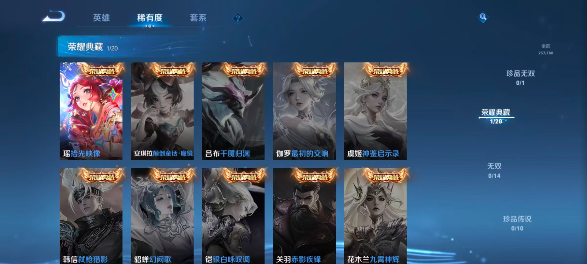 【稀有英雄】敖隐(小龙人),大司命,嬴政(始皇帝),韩信(韩跳跳),夏洛特(夏师傅),艾琳,橘右京(橘子),娜可露露(鸟人),不知火舞,赵云,金蝉(唐僧),戈娅