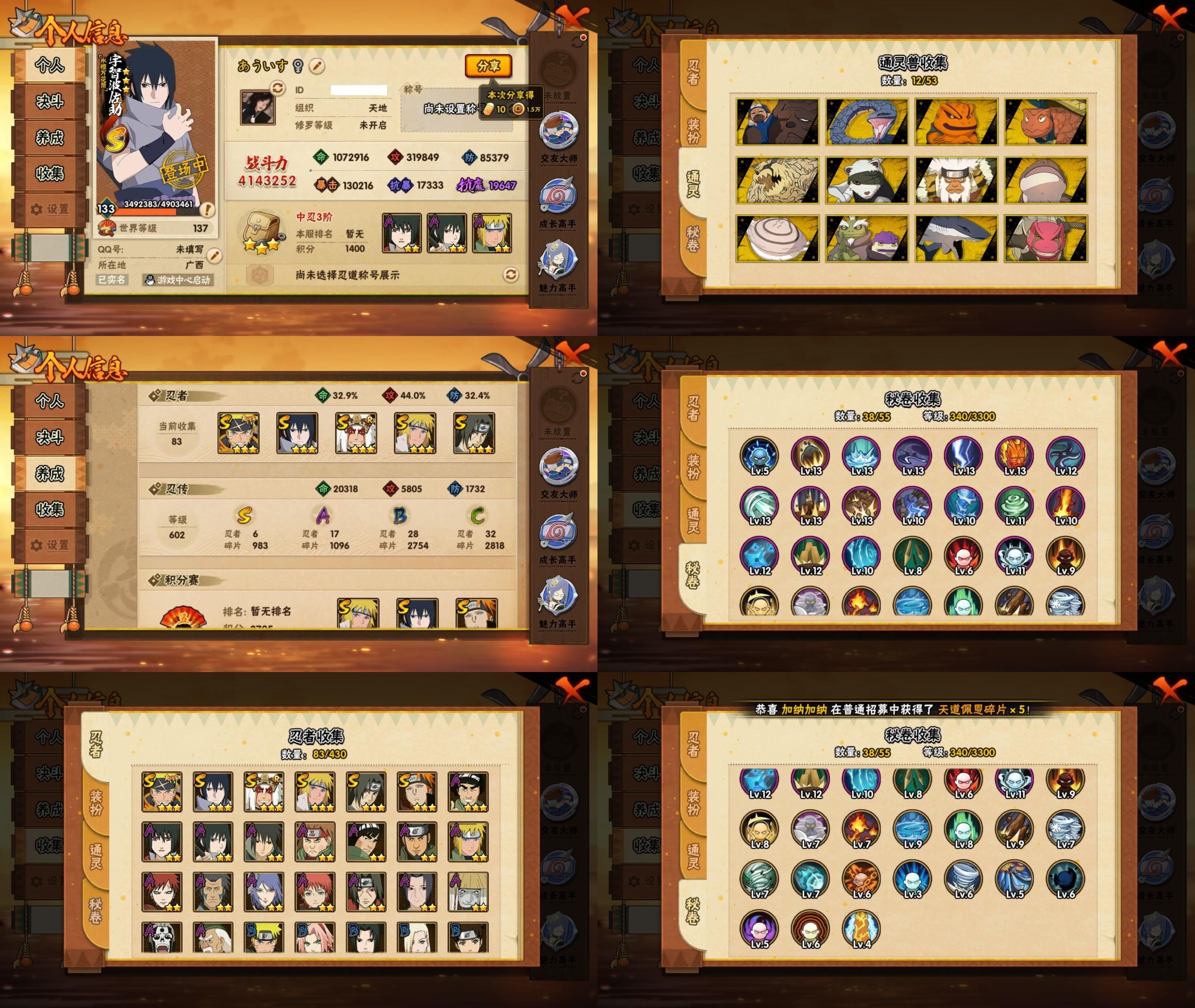 6S忍/17A忍/战力414W/V4/区服3552 【S忍者】宇智波佐助「漩涡鸣人」,宇智波佐助「永恒万花筒」,自来也「舞之豪杰」,宇智波鼬「须佐能乎」,佩恩「天道」,波风水门,【A忍者】小南「神驹佑将」,大野木「侠隐江湖」,迈特凯「青春爆炸」,宇智波鼬「夏日限定」,不动,宇智波泉奈,波风水门