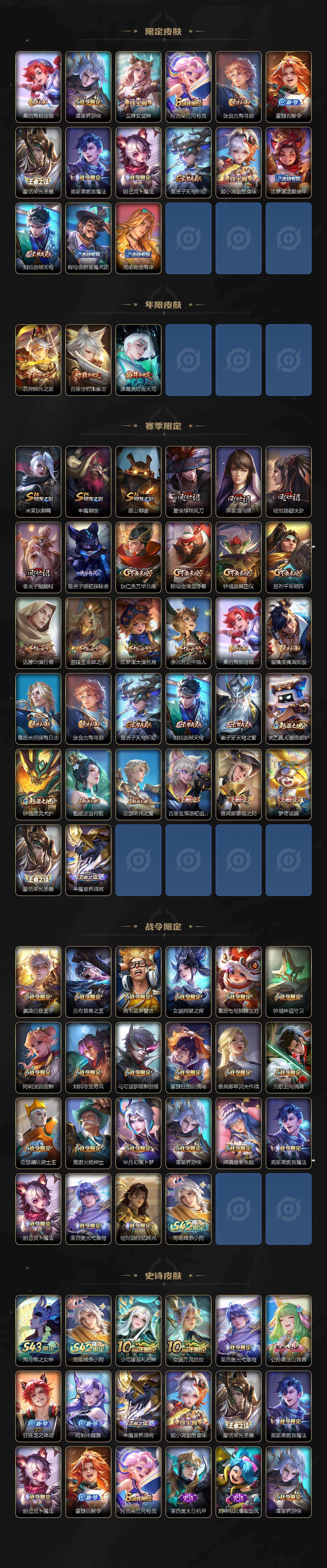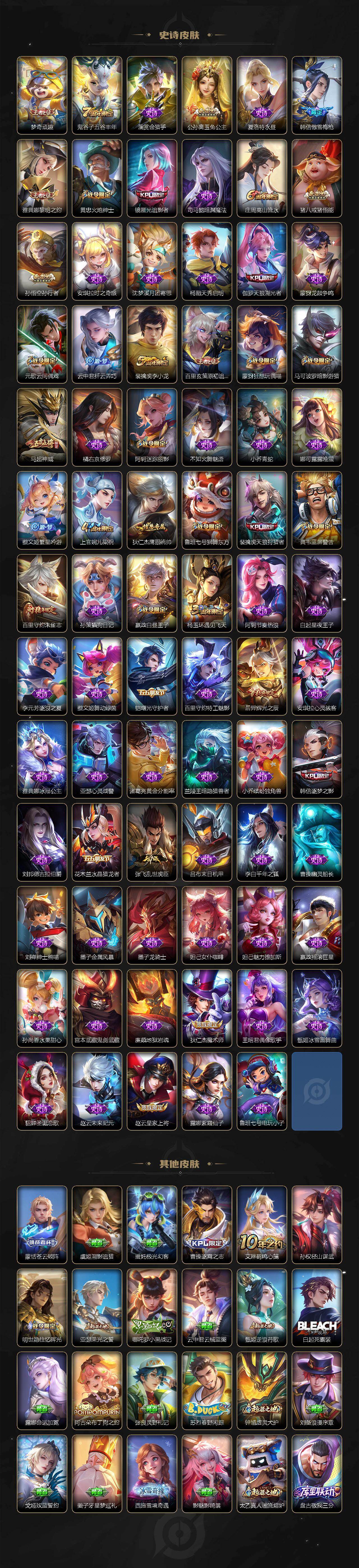 贵族等级8/荣耀典藏数量2/传说皮肤数量14/史诗皮肤数量92/皮肤数量286/英雄数量129/段位永恒钻石/孙权全皮/敖隐全皮/鸣剑·曳影 李白/神鉴启示录 虞姬/黑崎一护 宫本武藏/幻光神枪 云缨/炽翼辉光 伽罗/启示之音 露娜/飞鸢探春 李元芳/时雨天司 诸葛亮/炽阳神光 镜/启明星使 虞姬/零号·赤焰 孙悟空/云鹰飞将 曜/一念神魔 李信/云霓雀翎 虞姬/武陵仙君 诸葛亮/末日机甲 孙