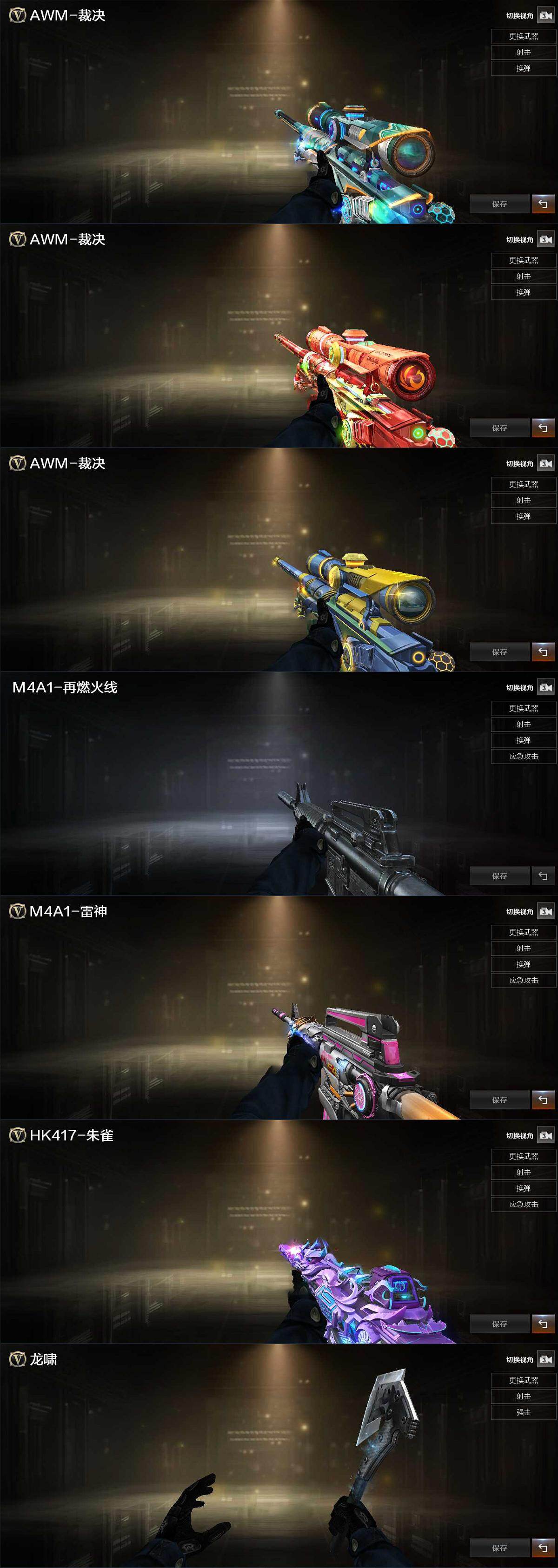 【音效卡】:屠龙-电竞之星-竞星跃动音效卡,AWM-裁决音效卡,HK417-朱雀-电竞之星-竞星跃动音效卡,M4A1-赤狱骑士-怀旧音效卡,Barrett-碧霄极光音效卡,炼狱-百战金芒-庆典舞曲音效卡,天罚-斗烈龙驹-斗烈音效卡