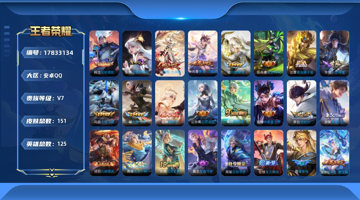 实名: 可修改 贵族等级: V7 英雄数: 125 皮肤数: 151 荣耀水晶: