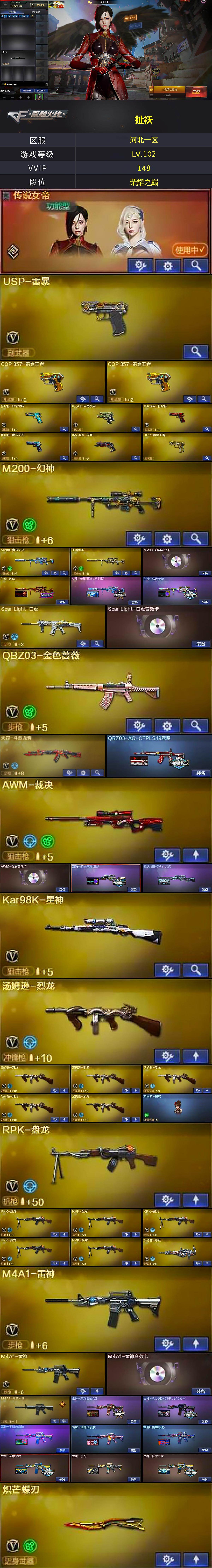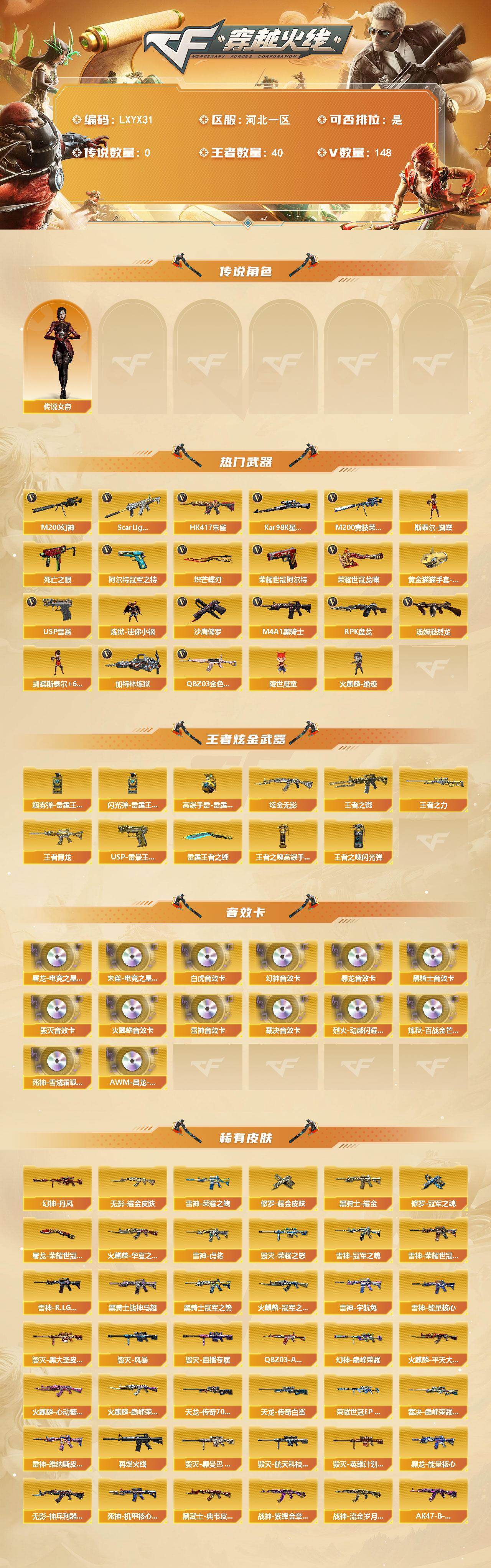 【LXYX31】138V/102级/荣耀元首/40王者/1炫金/10英雄/传说女帝/QBZ03-金色蔷薇/Scar Light-白虎/HK417-朱雀/M200-幻神/M200-竞技荣光/死亡之眼/柯尔特-冠军之特/柯尔特-荣耀世冠/Kar98k-星神/炼狱-迷你小钢/M4A1-黑骑士/汤姆逊-烈龙/RPK-盘龙/加特林-炼狱/斯泰尔蝴蝶/降世魔童/火麒麟-绝迹/USP雷暴/沙鹰-修罗/炽芒蝶刃/龙啸-荣耀世冠/黄金猫猫手套-白鲨/蝴蝶斯泰尔+6烈龙/王者之戮/王者青龙/王者之力/USP雷暴王者