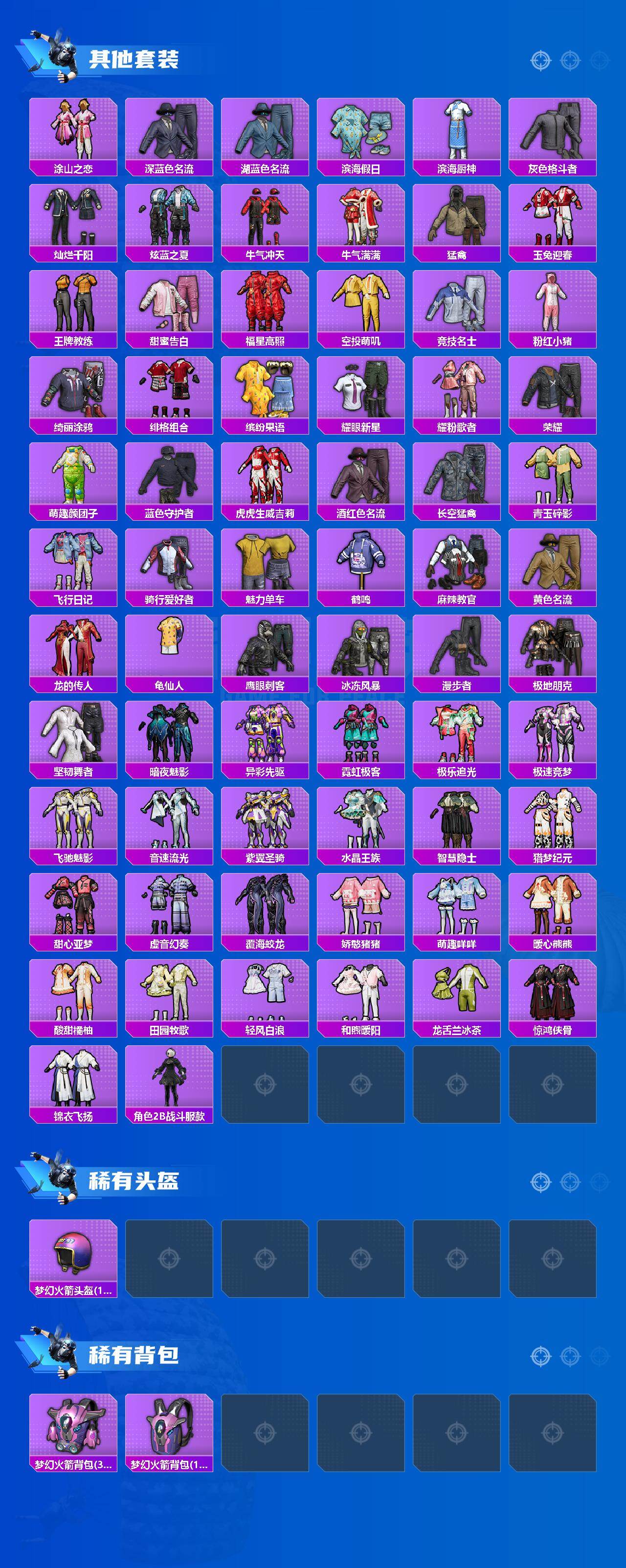 HJ6792 可二 65级 9粉装3特效枪131套装180枪皮11印记 【9粉装】 梦幻火箭 绚丽摇曳 第五大道 冰霜白皇 炙焰红王 霞光圣骑 紫电风暴 寒光使者 复仇流浪者 【3特效枪】 Kar98K-巳巳如意 (5级) DP-28-豹影疾电 (5级) M762-冷魅冰骑 (7级) 【8热门】 龟仙人 2B战斗服款 晶辉守护 鹰眼刺客 胖达团团 暗影哥特 粉红小猪 漫步者 【1飞行器】 太